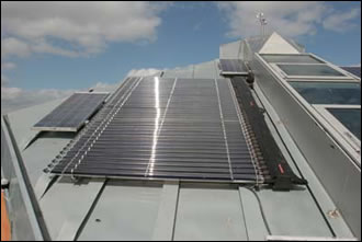 Positioned on the Solar Chimney, solar evacuated tubes provide hot water and supplementary space heating, and photovoltaic panels are used to power the BMS