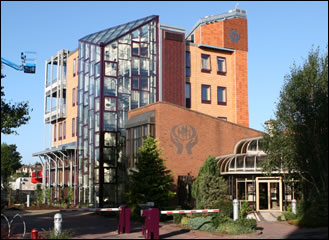 Years of research have gone into this timber structure. We trawled Europe and North America for the most advanced timber technology. We’ve gone to see the leading people in Austria , Germany , Switzerland , and Scandinavia , and to cut a very long story short, Projekt-Holzbau Merkle in South Germany had previously earned their credentials with a colleague of ours in GAIA International, Joachim Eble. With their engineers, Pirmin Jung, we worked through a design process within the terms of Eurocode 5, BS 5268 and the German DIN standards amongst others to develop the design. The key point of the structure over five stories, of course, turns on the connections. The delightful engineering involves tiny amounts of steel used to form the connections, but this steel is totally submerged within timber, so that the timber itself is acting as an insulant to the thermally vulnerable steel, in terms of fire protection. The building is being presented at the Garmisch conference later this year by Pirmin Jung, and there is great interest in the building. We devised the basic structural scheme but great credit must go to Pirmin Jung’s team for detailed analysis and shop drawings.