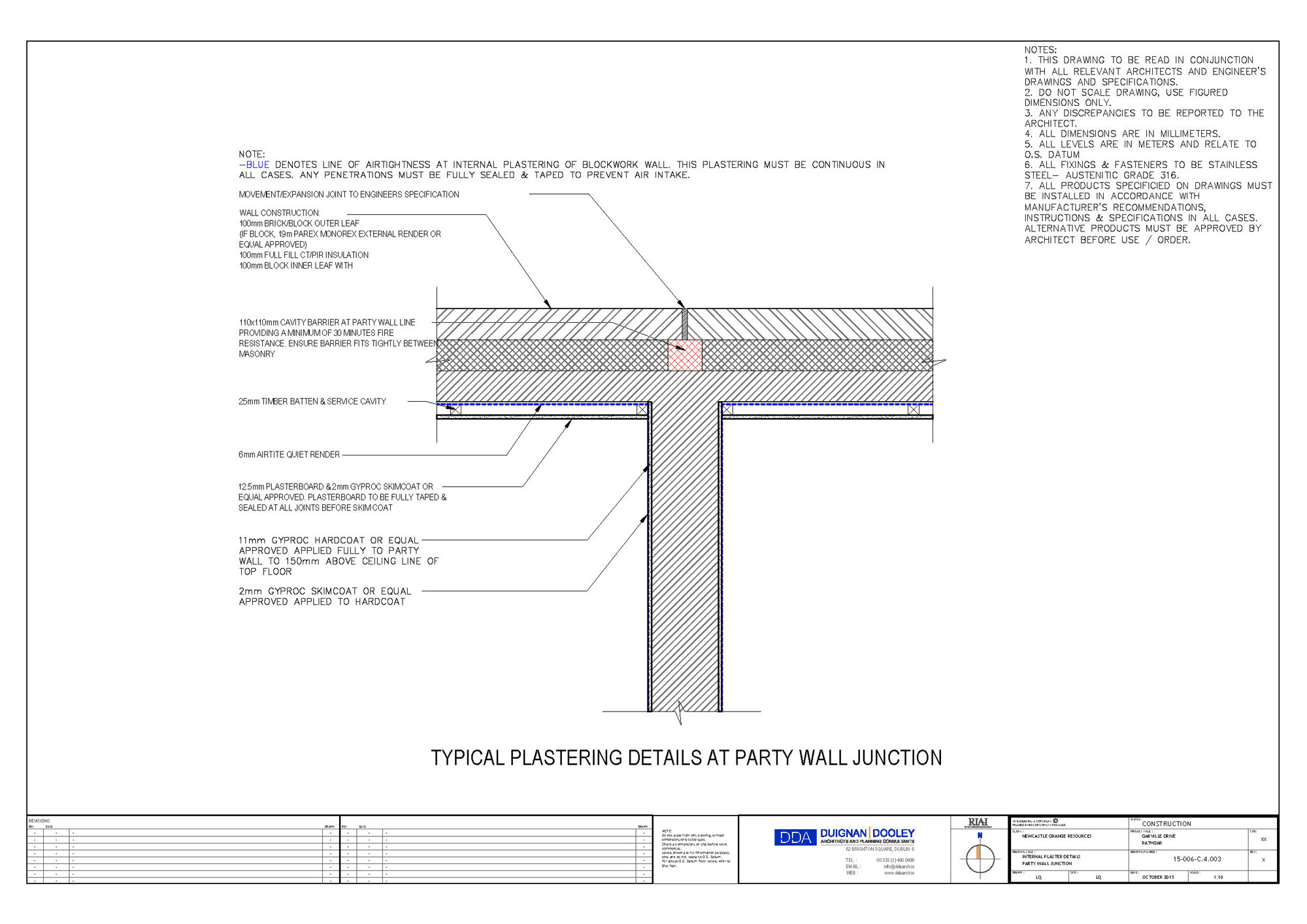 The build team also used a Gyproc product called Airtite Quiet on the outer leaf. As the name suggests, it delivers an element of both airtightness and sound proofing. In combination with the sand and cement render on the inner leaf, plus the suite of airtightness membranes and tapes, these products and techniques delivered an airtightness result of 1.88 ACH @ +/-50Pa or 2.15 m3/ m2/hr – lauded by Mark Shirley of 2eva.ie as an “excellent result in light of the four-storey buildings” and the attendant complexity.