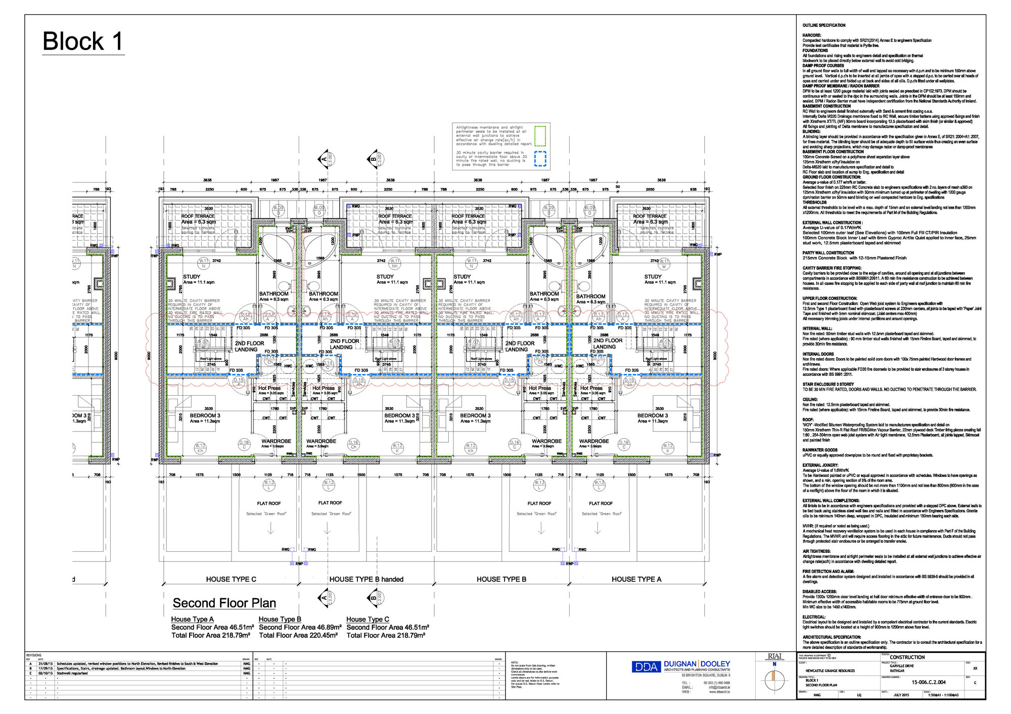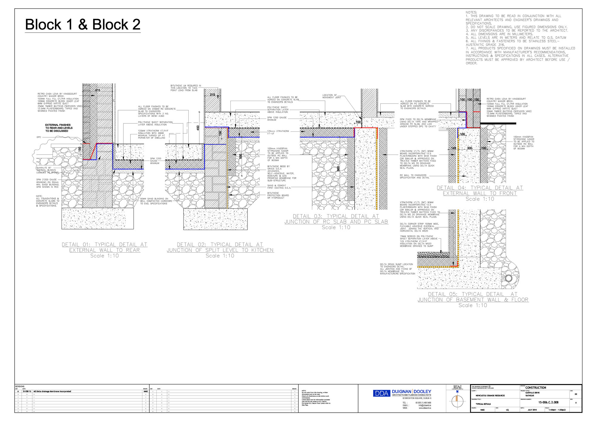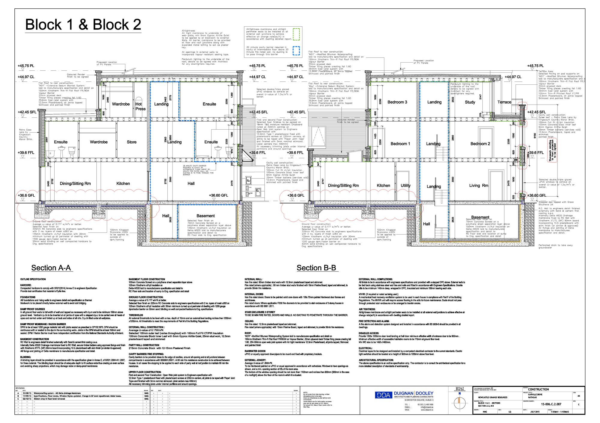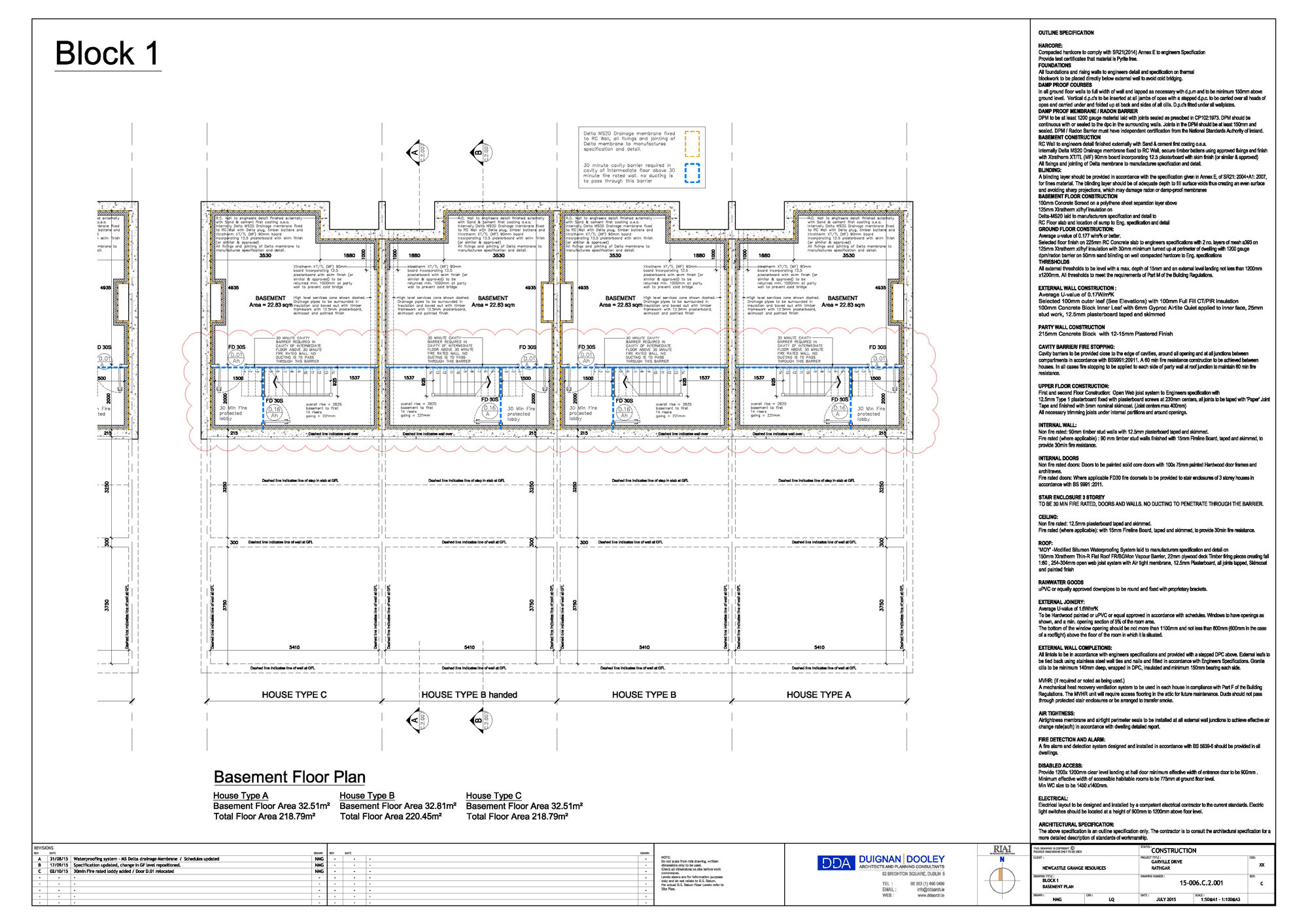 Condensation is one risk to manage, but in a development like Garville Drive with basements, water ingress is another that requires particular care. A Delta tanking system was installed – including a fully sealed membrane in the basement slab and external walls up to the basement ceiling, which is above the water table. John Curley of plastering contractor Ardlea Construction describes the Delta system as “the Rolls Royce System. If the water does get in, it takes care of it. It comes with a drainage channel internally, so that if the water comes back into it it goes into a sump pump. While every measure has been taken to prevent water getting in, in the event that it ever does, the pump is there to take care of it.”