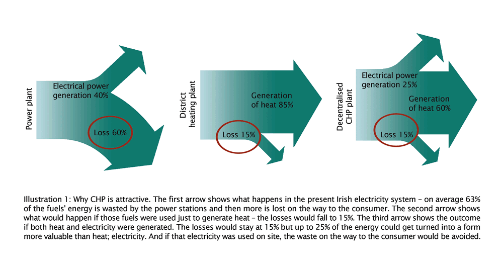 Illustration 1: Why CHP is attractive. The first arrow shows what happens in the present Irish electricity system – on average 63% of the fuels' energy is wasted by the power stations and then more is lost on the way to the consumer. The second arrow shows what would happen if those fuels were used just to generate heat – the losses would fall to 15%. The third arrow shows the outcome if both heat and electricity were generated. The losses would stay at 15% but up to 25% of the energy could get turned into a form more valuable than heat; electricity. And if that electricity was used on site, the waste on the way to the consumer would be avoided.