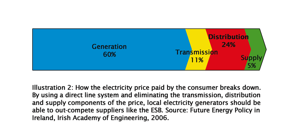 How the electricity price paid by the consumer breaks down. By using a direct line system and eliminating the transmission, distribution and supply components of the price, local electricity generators should be able to out-compete suppliers like the ESB. Source: Future Energy Policy in Ireland, Irish Academy of Engineering, 2006.