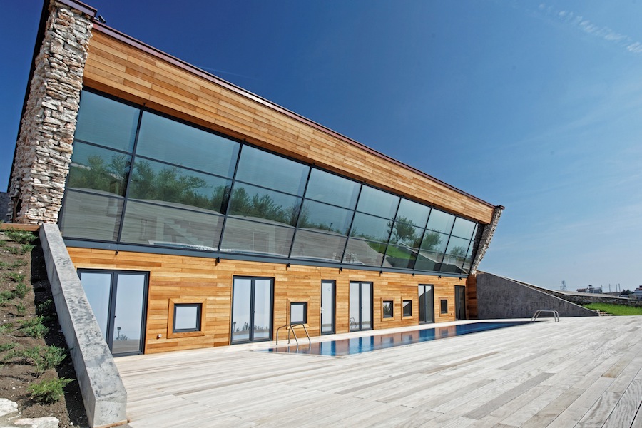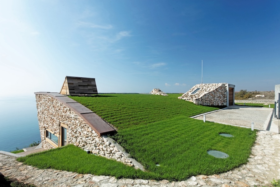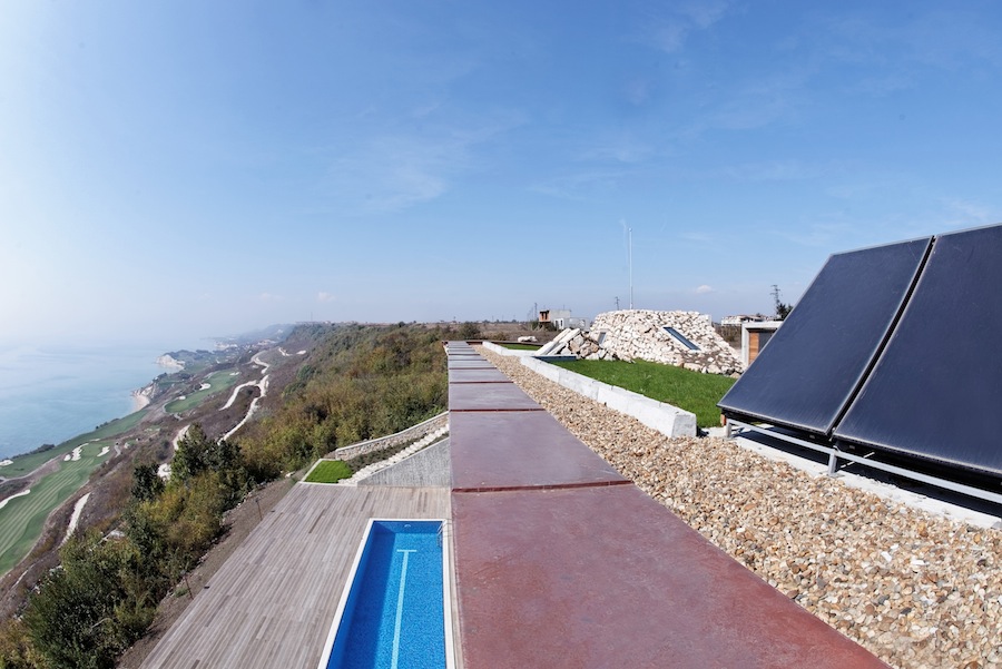 The house features a green roof that is planted with local grasses, and the dwelling also boasts triple glazing, heat recovery ventilation and solar thermal panels. There's also a swimming pool that draws excess heat from the solar collectors in summer, though no doubt some readers will be skeptical about how green a house with a swimming pool — and a floor area of 500 square metres — can be. Rainwater collection features too — it's mandatory in this region of Bulgaria — while according to the architects a "small bio-active wastewater treatment unit turns waste into dry bio-compost and irrigation water".