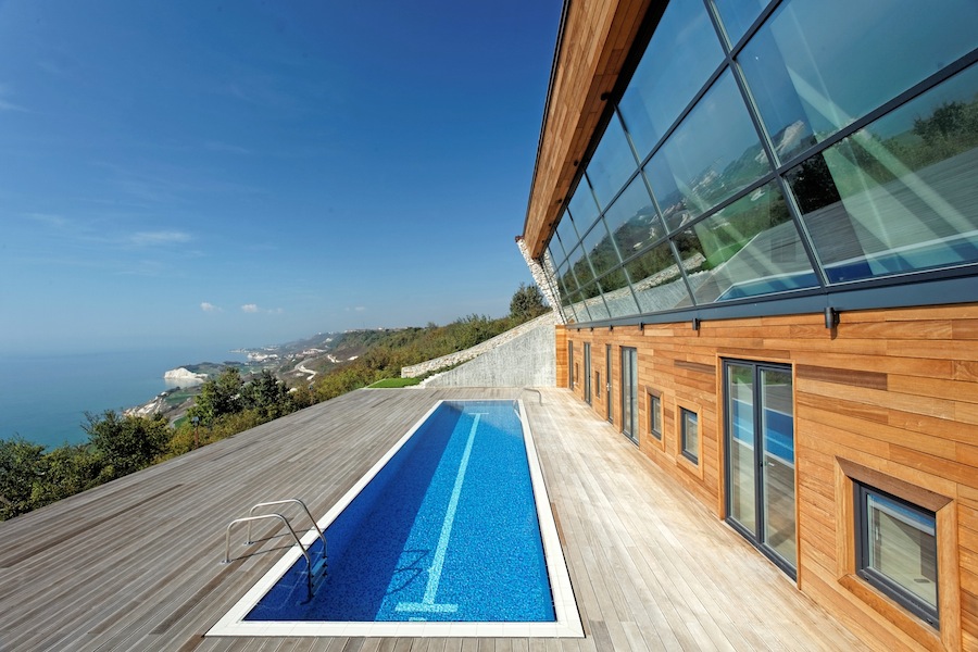 Local materials and labour were used in order to avoid cost and pollution from unnecessary transportation. The house's annual heating demand is 15 kWh/m2/yr, while U-values are 0.15 for walls, 0.10 for the roof and 0.80 for windows. More info on this striking house from Evolo.
