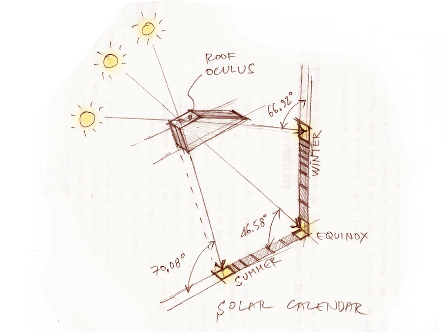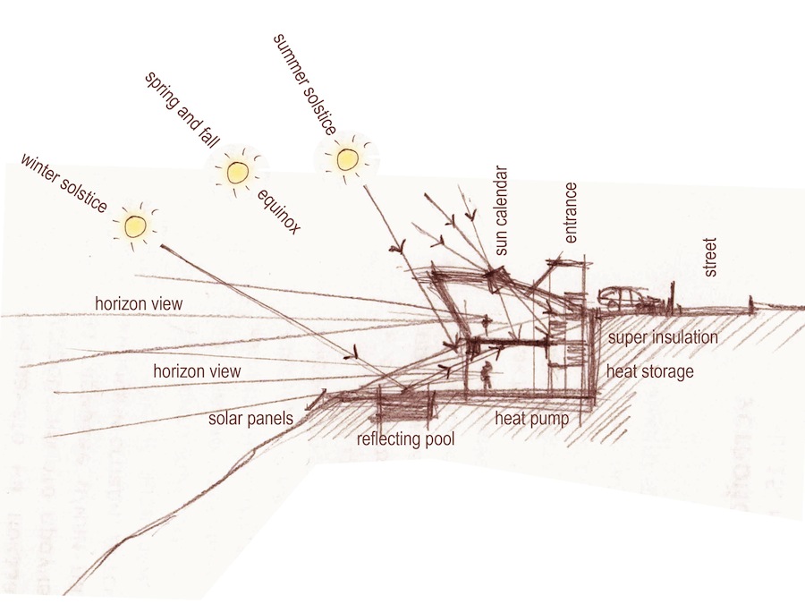 Built into a steep hillside, a narrow oculus in the roof creates a concentrated sunspot on the living room wall, the position of which indicates the time of year. The main glazed facade, which overlooks the sea, is also parallel with the sun at noon on the summer solstice.