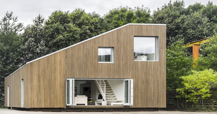 The house has an insulated bamboo facade that wraps around three shipping containers. This first example was erected in Wuxi, China, and was designed to meet the active house standard. It features a green roof with an integrated 30 square metre solar PV array. Rainwater is also harvested for toilet flushing, washing and cleaning. More info and photos here.