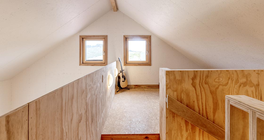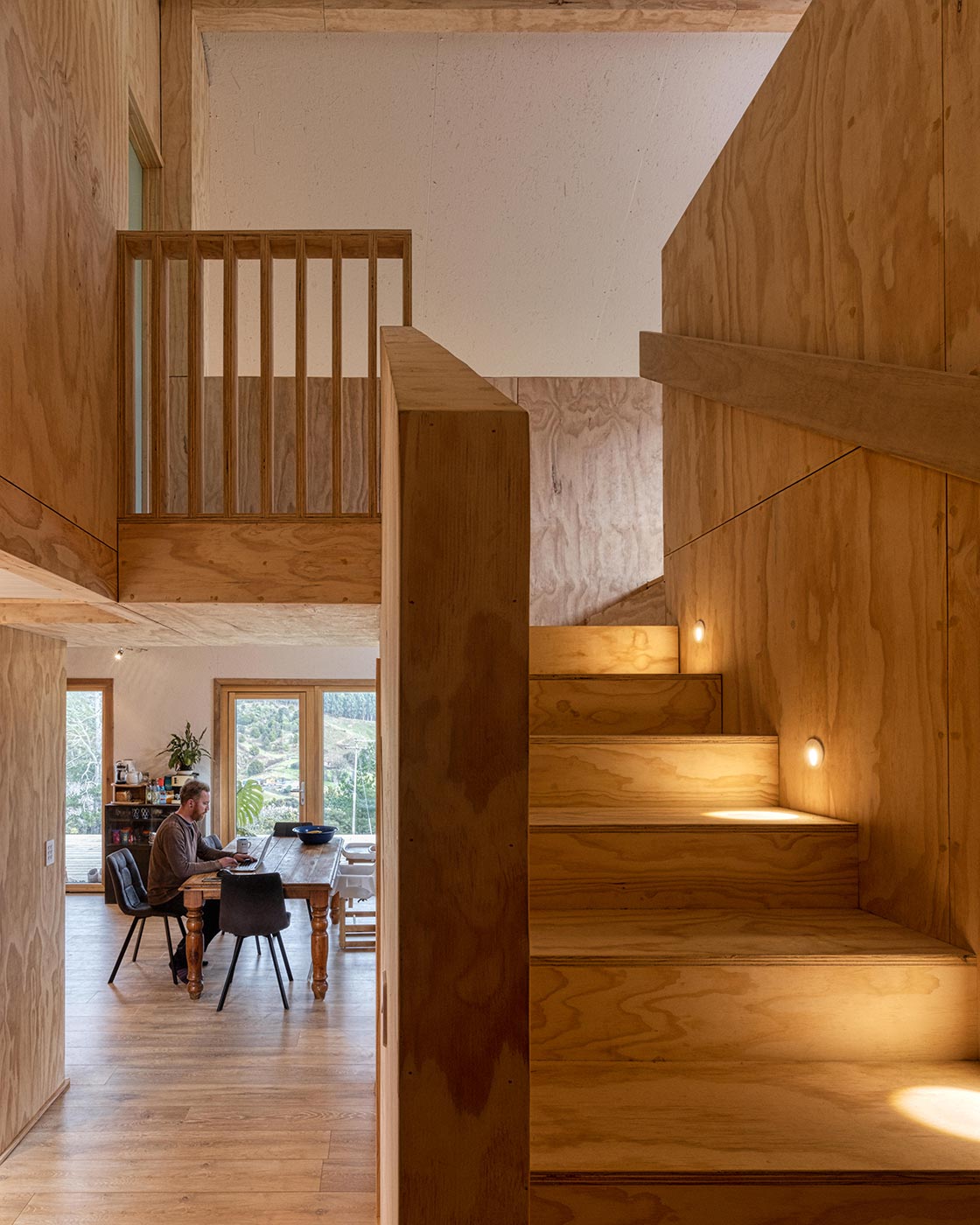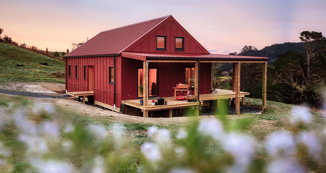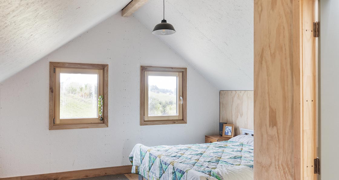 Painted plywood cladding and metal roofing were selected externally, with a scoria red finish reminiscent of tramping huts and embodying the local rural vernacular.