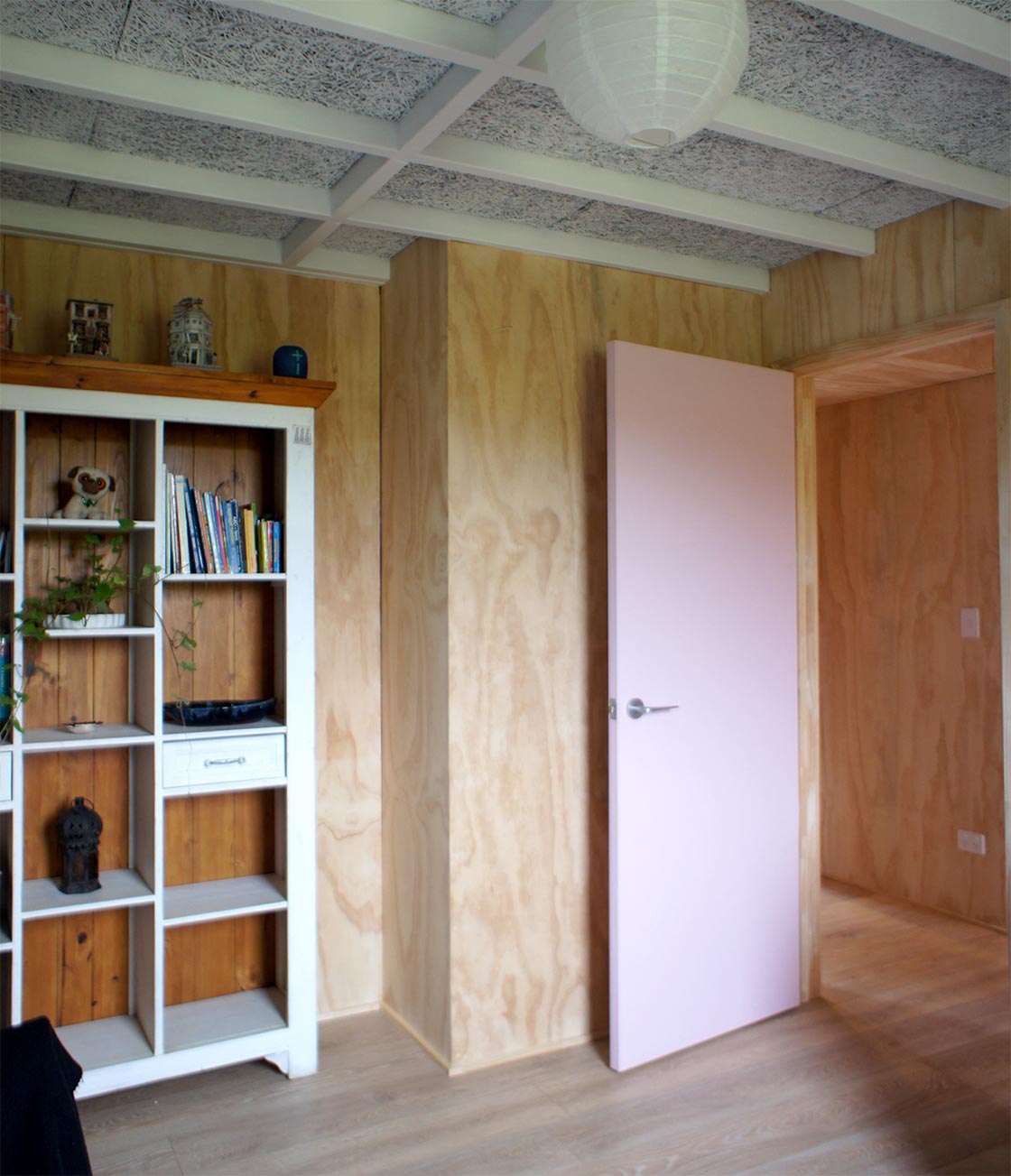 Internally the SIPs were painted as opposed to lining them, reducing trades and cost. Plywood linings were selected for interior walls — lower carbon than plasterboard, and easier for sanding off children’s drawings.