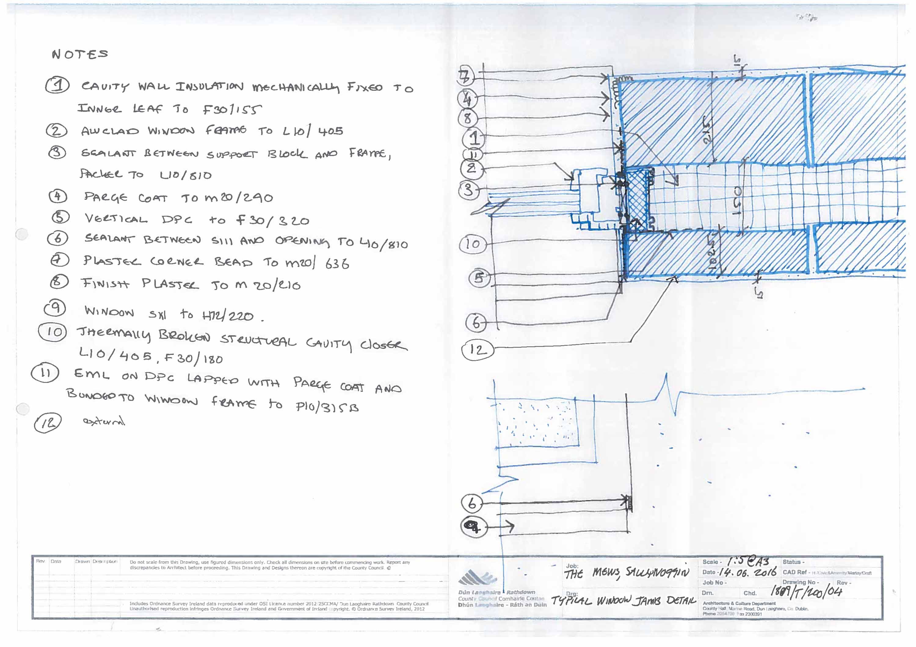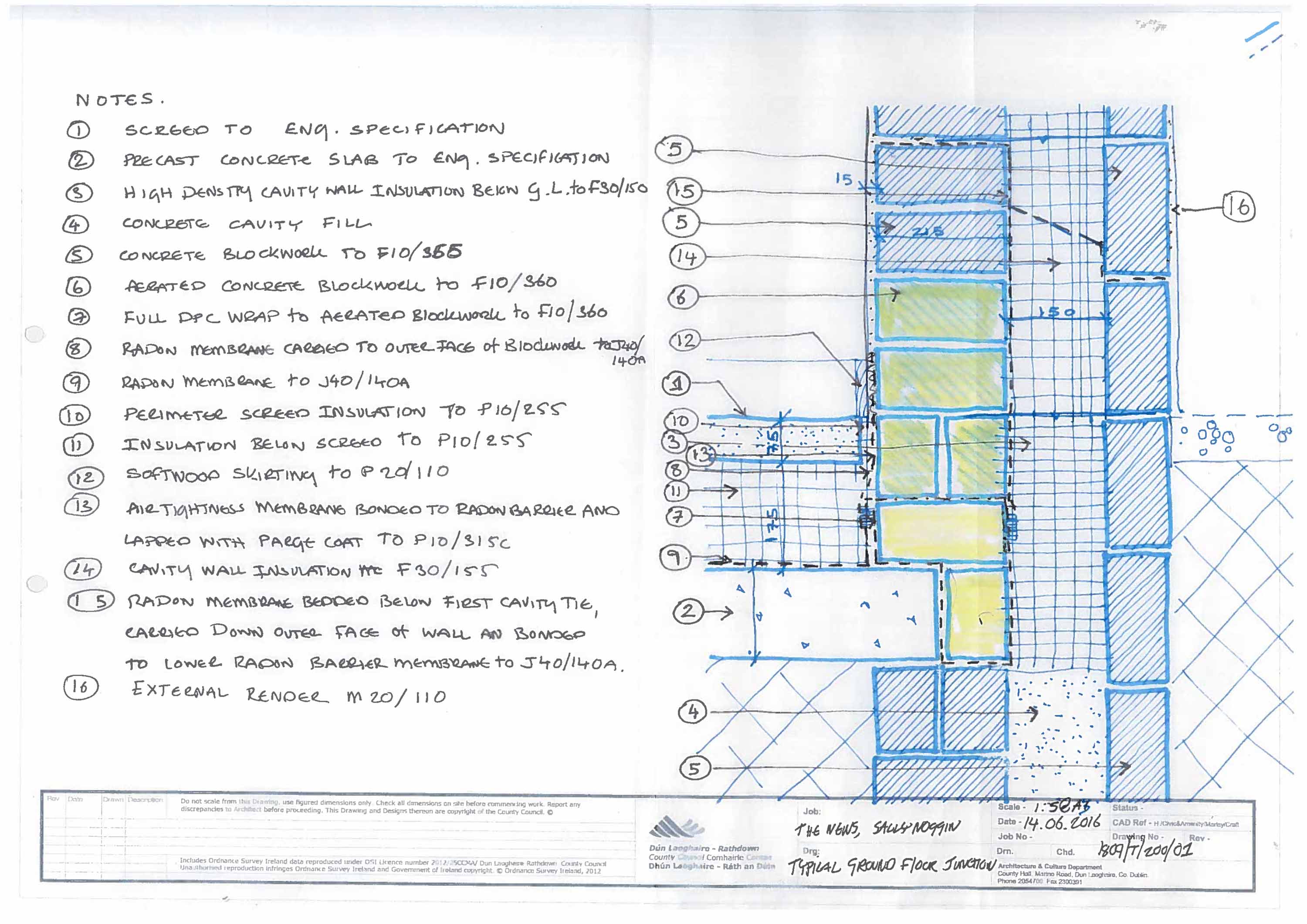 Walls: External render on concrete block, on full-fill Xtratherm Cavitytherm rigid PIR insulation, on concrete block. U-value: 0.15 W/ m2K. Quinn Lite thermal blocks to base of walls.