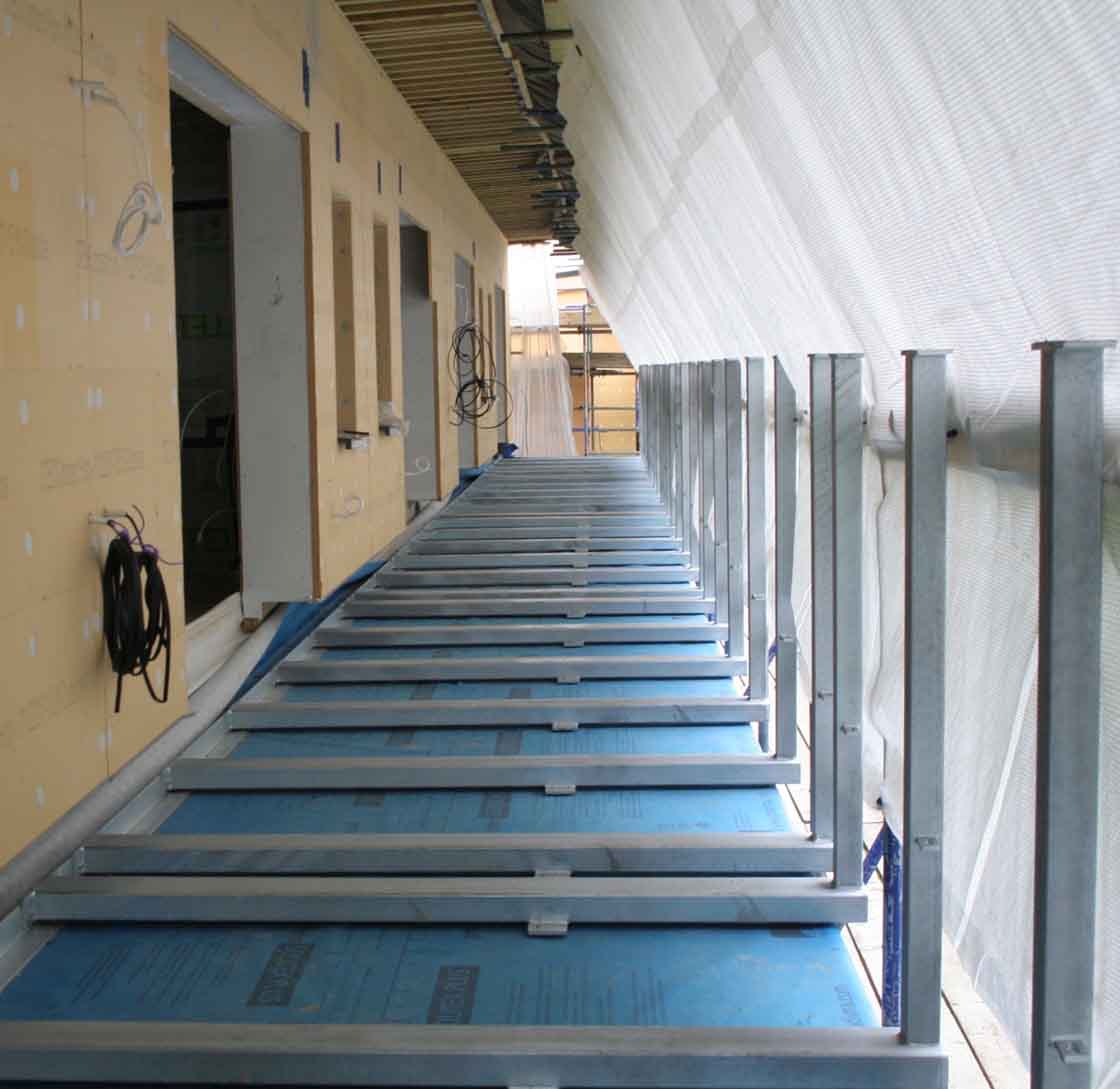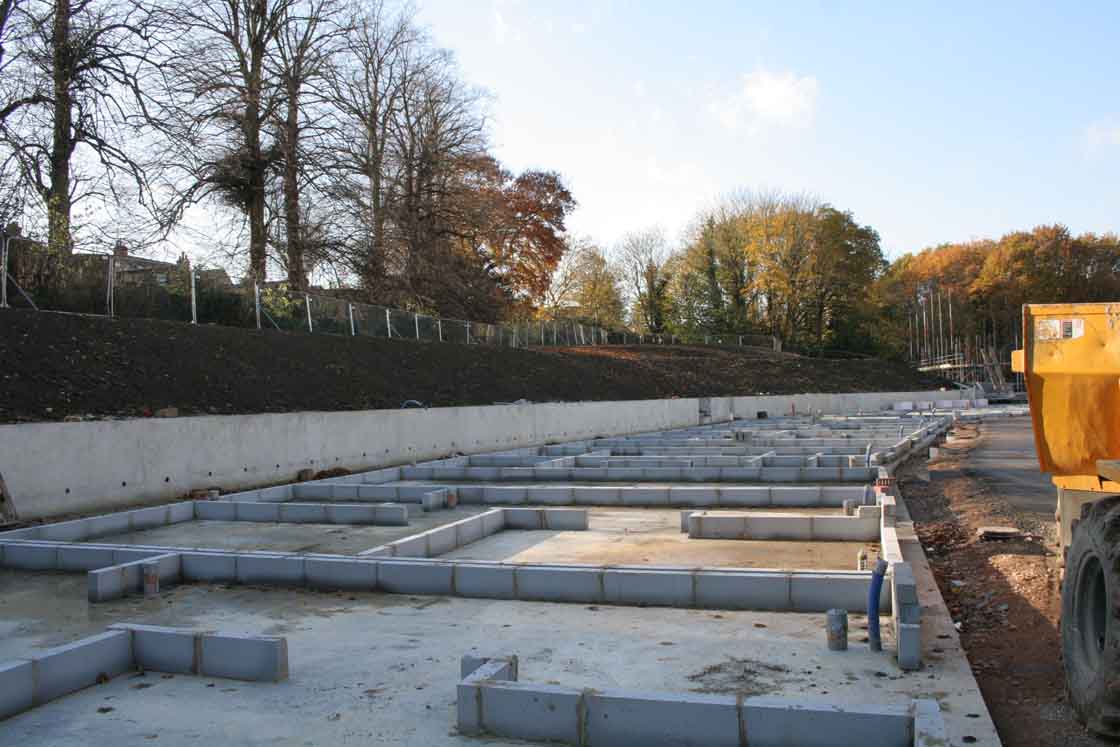 Ground floor: 10 mm bamboo flooring on 65 mm screed, on 150 mm PIR insulation (houses) or 150 mm phenolic insulation (flats), on 250 mm reinforced concrete, on 225 mm Cellcore HX S9/13 board. U-Values: 0.135 W/m2K (houses) and 0.108 W/m2K (flats)