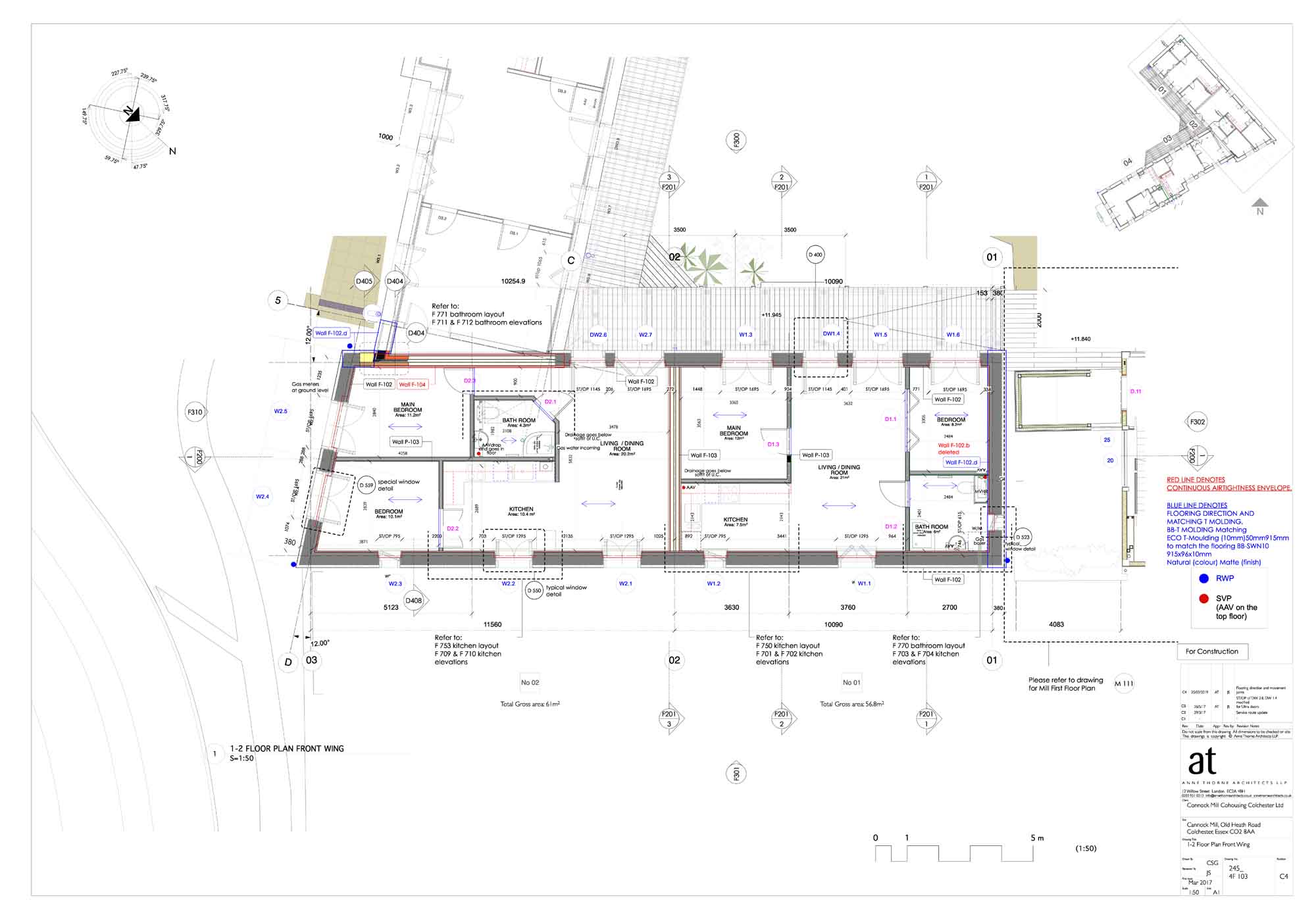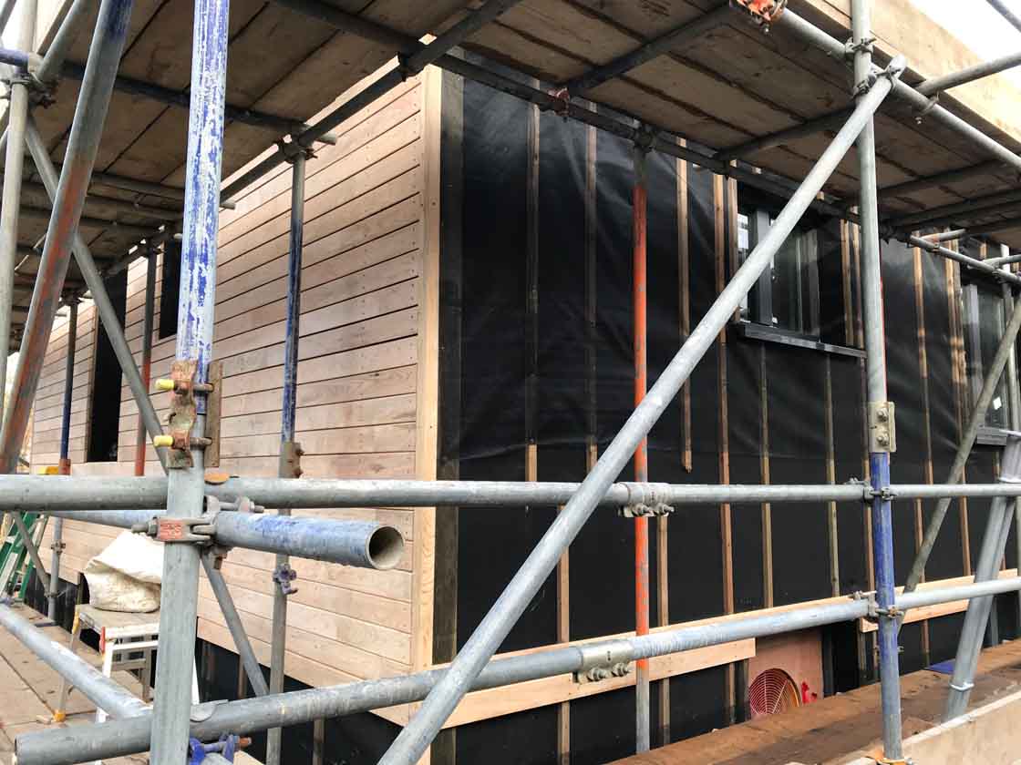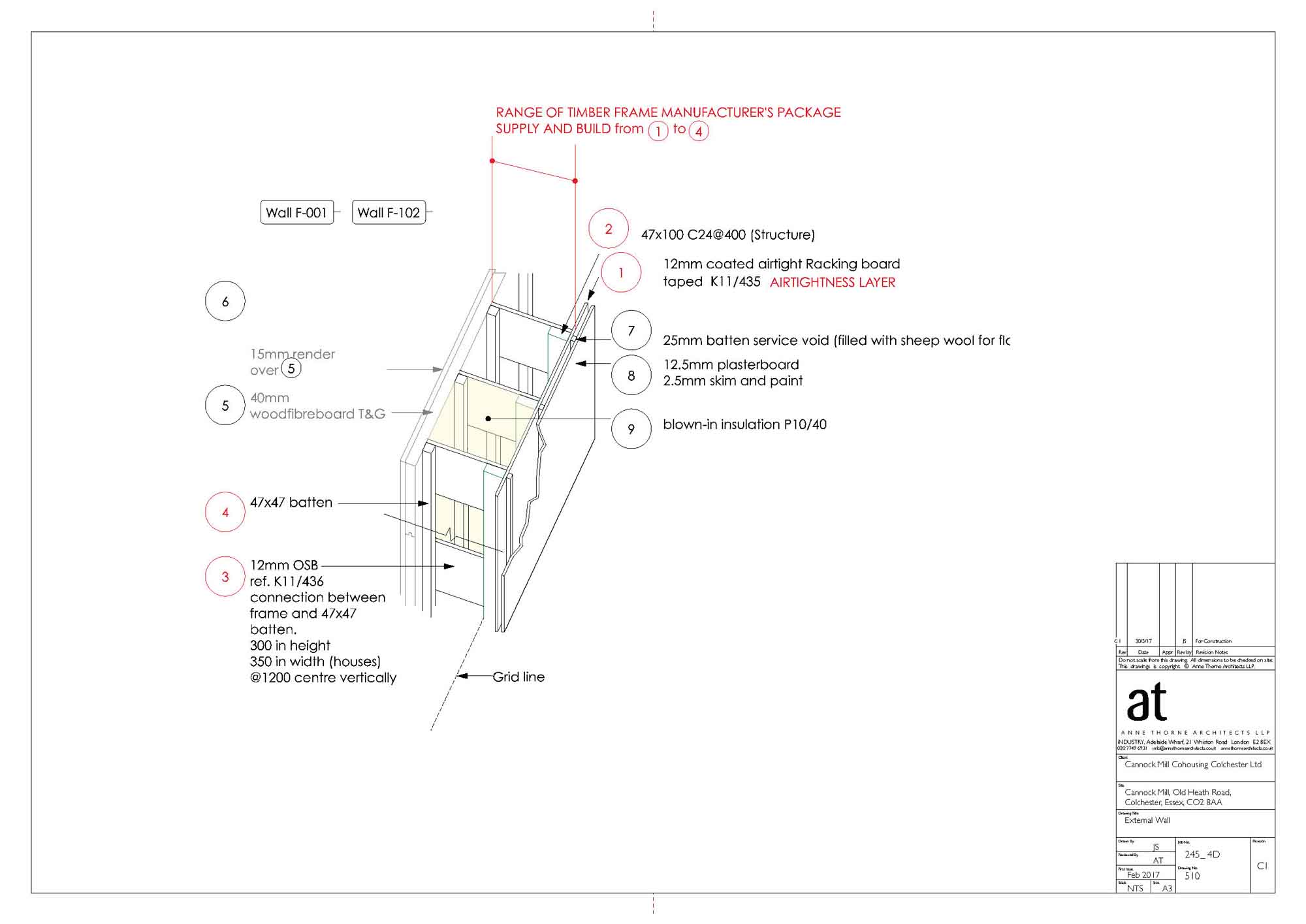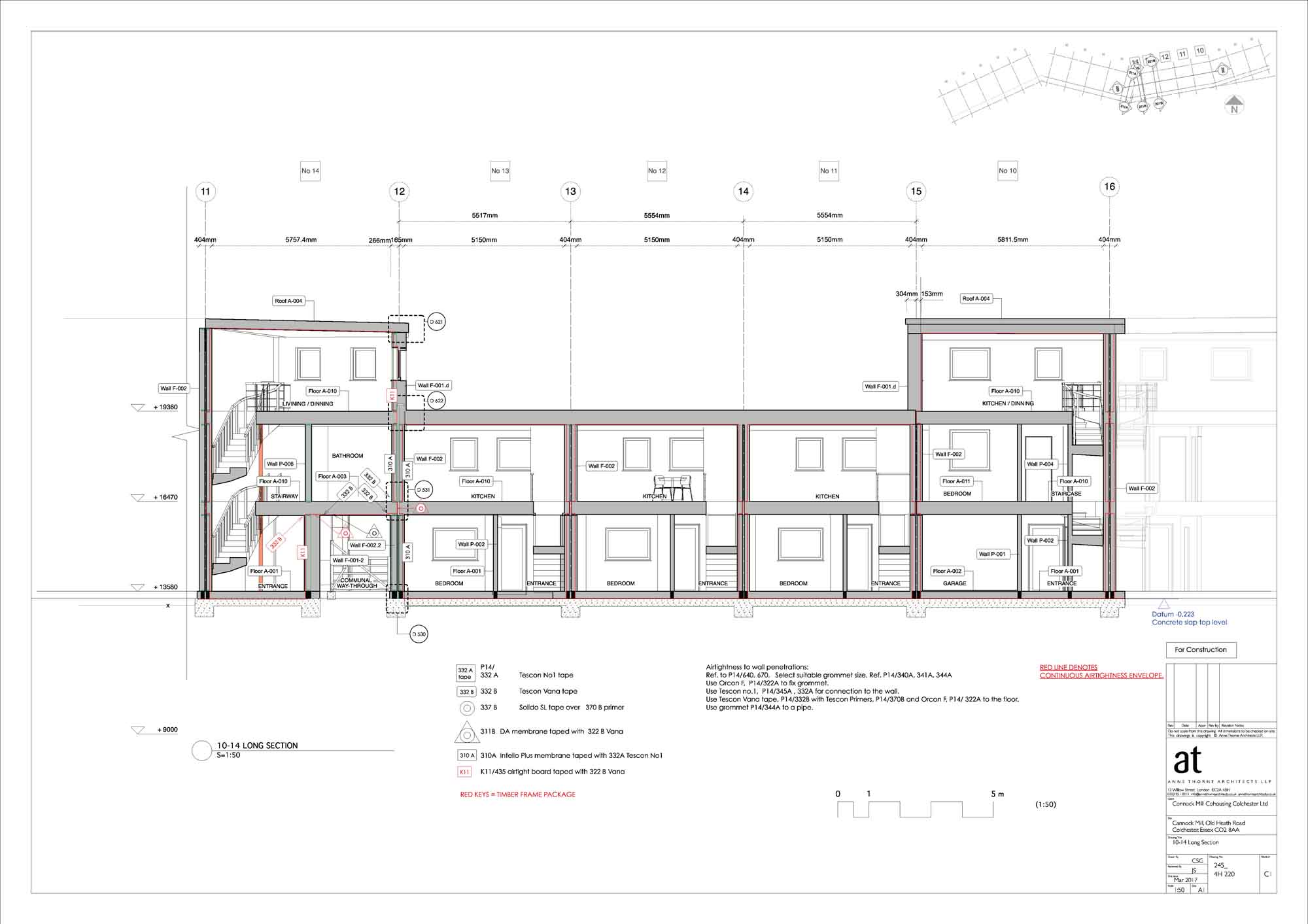 Walls (flats): 20 mm fire retardant treated European Oak cladding over insect mesh (flats) or zinc cladding on underlay and 18 mm WPB plywood externally, on 25 mm ventilation void, on Solitex Fronta Quattro membrane, on 22 mm wood fibre insulation, on 400 mm Warmcel cellulose insulation between structural timber frame and sub-frame, on 12 mm Smartply Propassiv airtight OSB, on 25 mm services zone insulated with Thermo Hemp Combi Jute, on plasterboard and paint finish. U-values: 0.092 W/ m2K (flats)