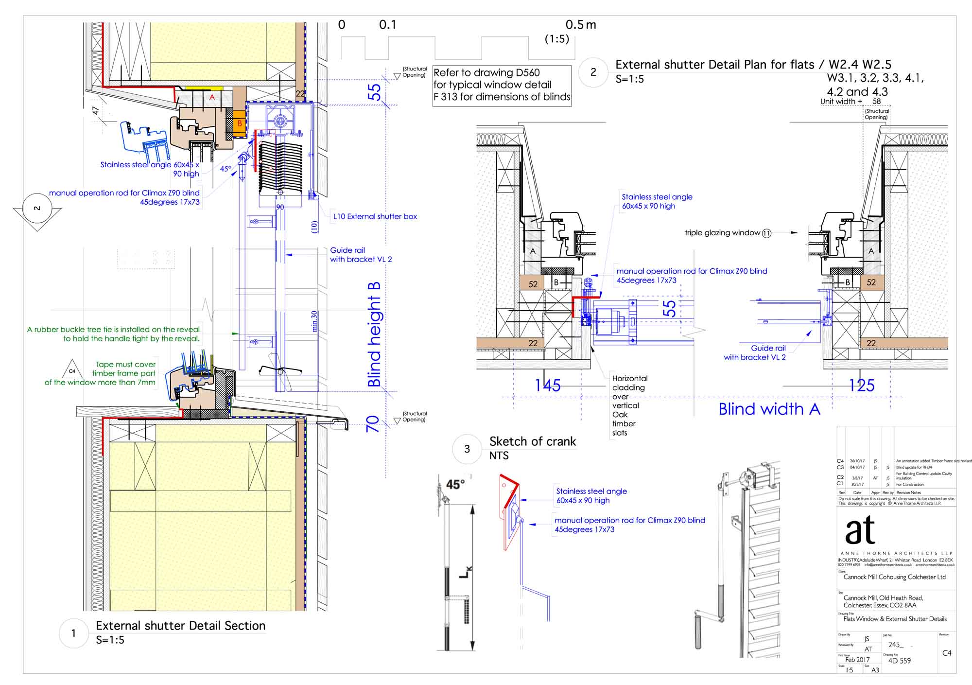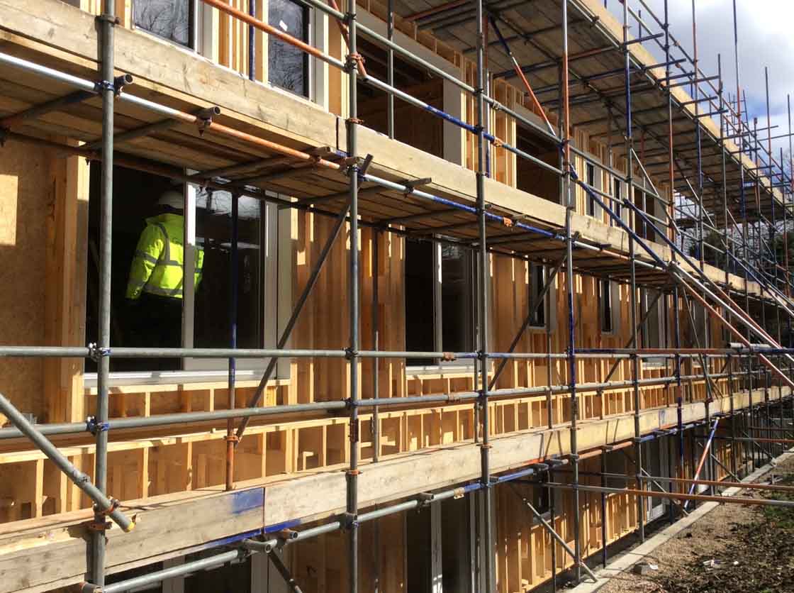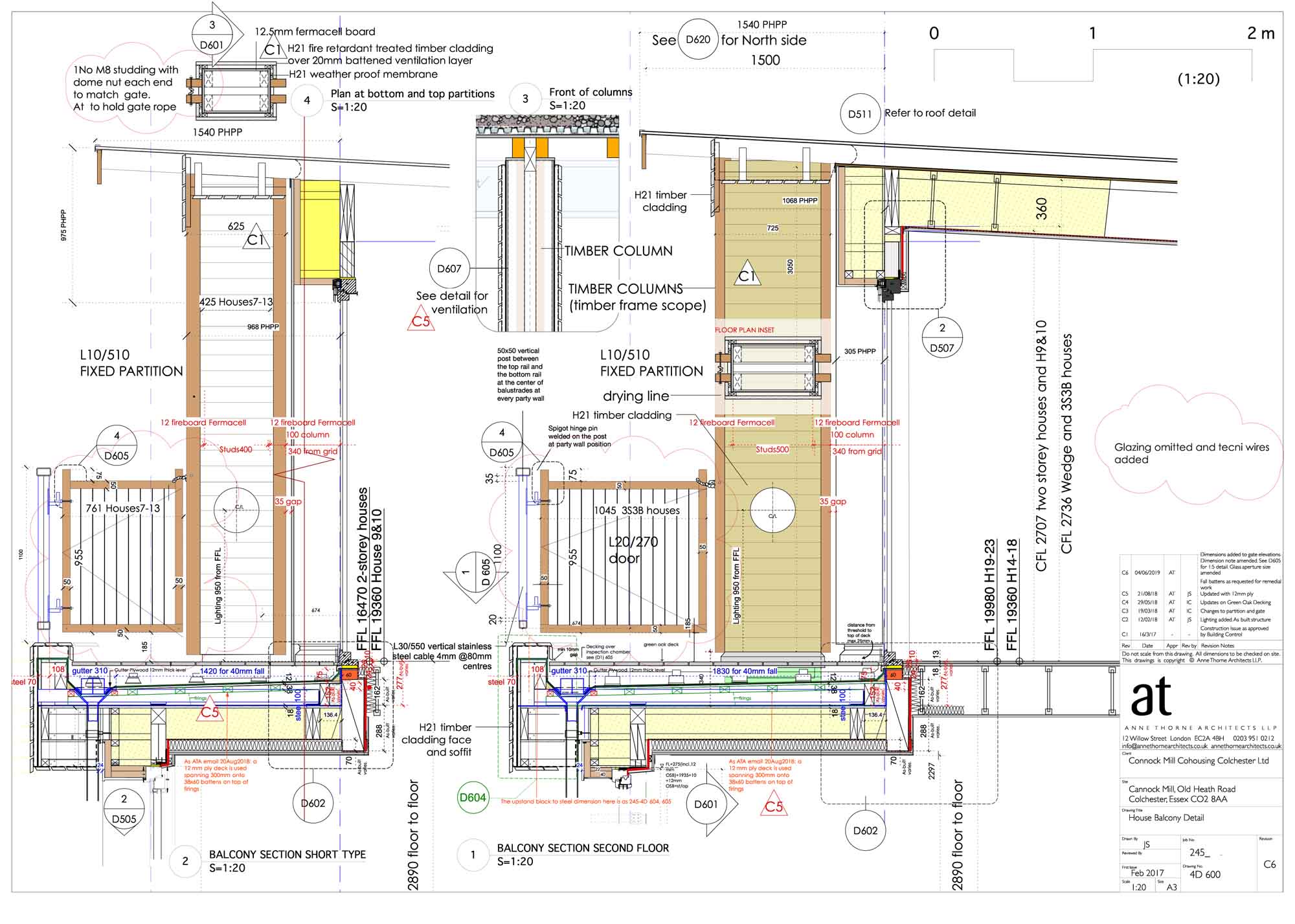 Walls (flats): 20 mm fire retardant treated European Oak cladding over insect mesh (flats) or zinc cladding on underlay and 18 mm WPB plywood externally, on 25 mm ventilation void, on Solitex Fronta Quattro membrane, on 22 mm wood fibre insulation, on 400 mm Warmcel cellulose insulation between structural timber frame and sub-frame, on 12 mm Smartply Propassiv airtight OSB, on 25 mm services zone insulated with Thermo Hemp Combi Jute, on plasterboard and paint finish. U-values: 0.092 W/ m2K (flats)
