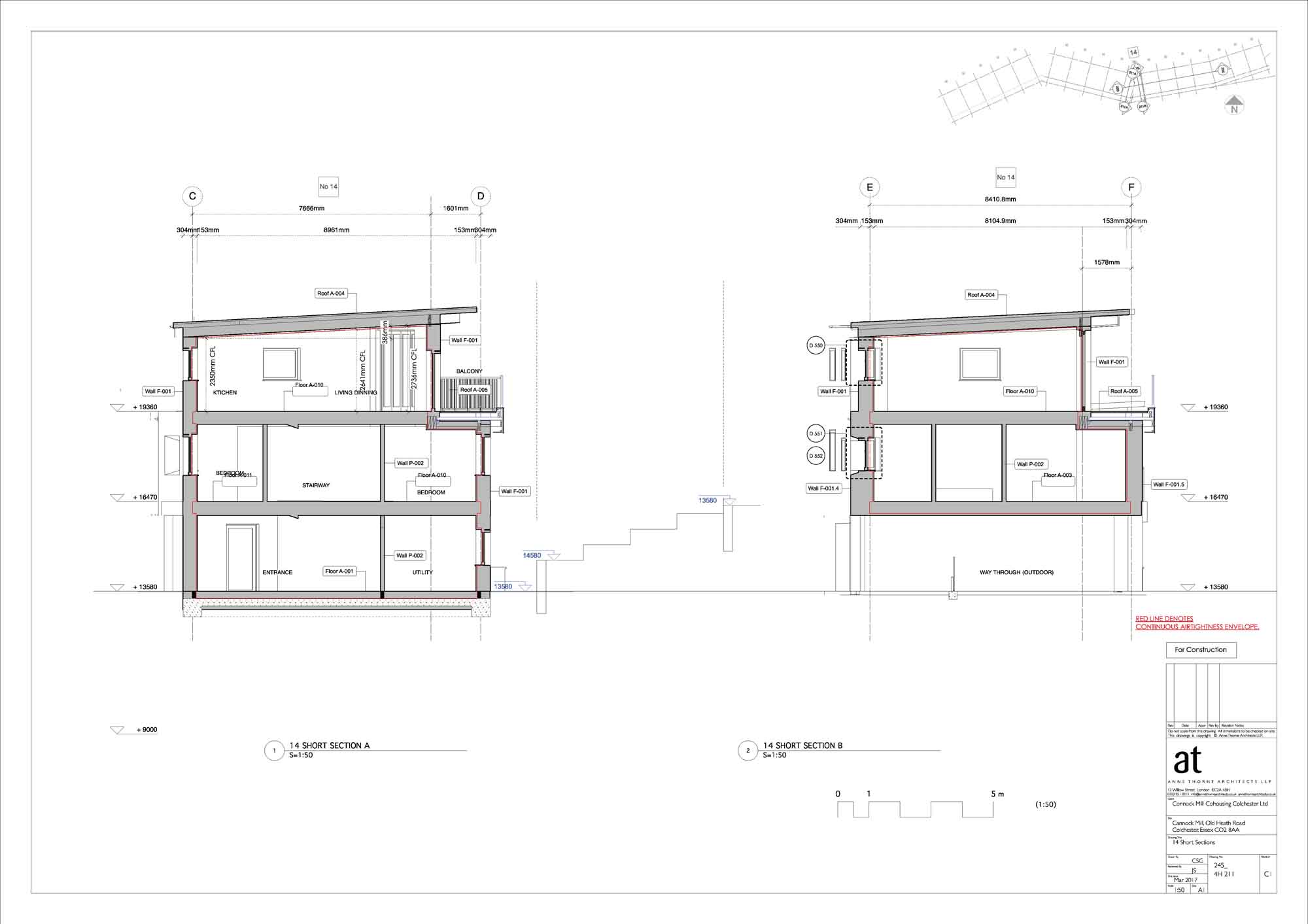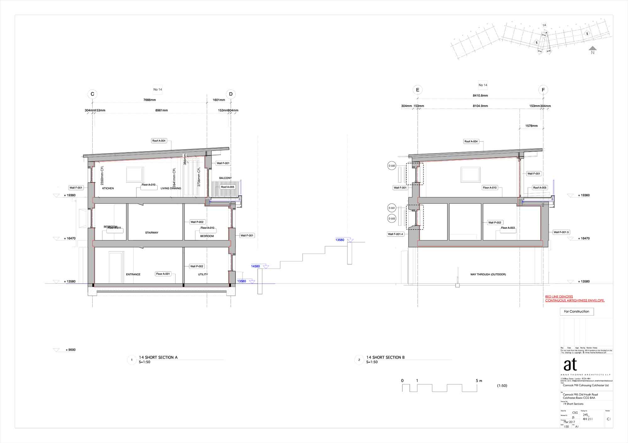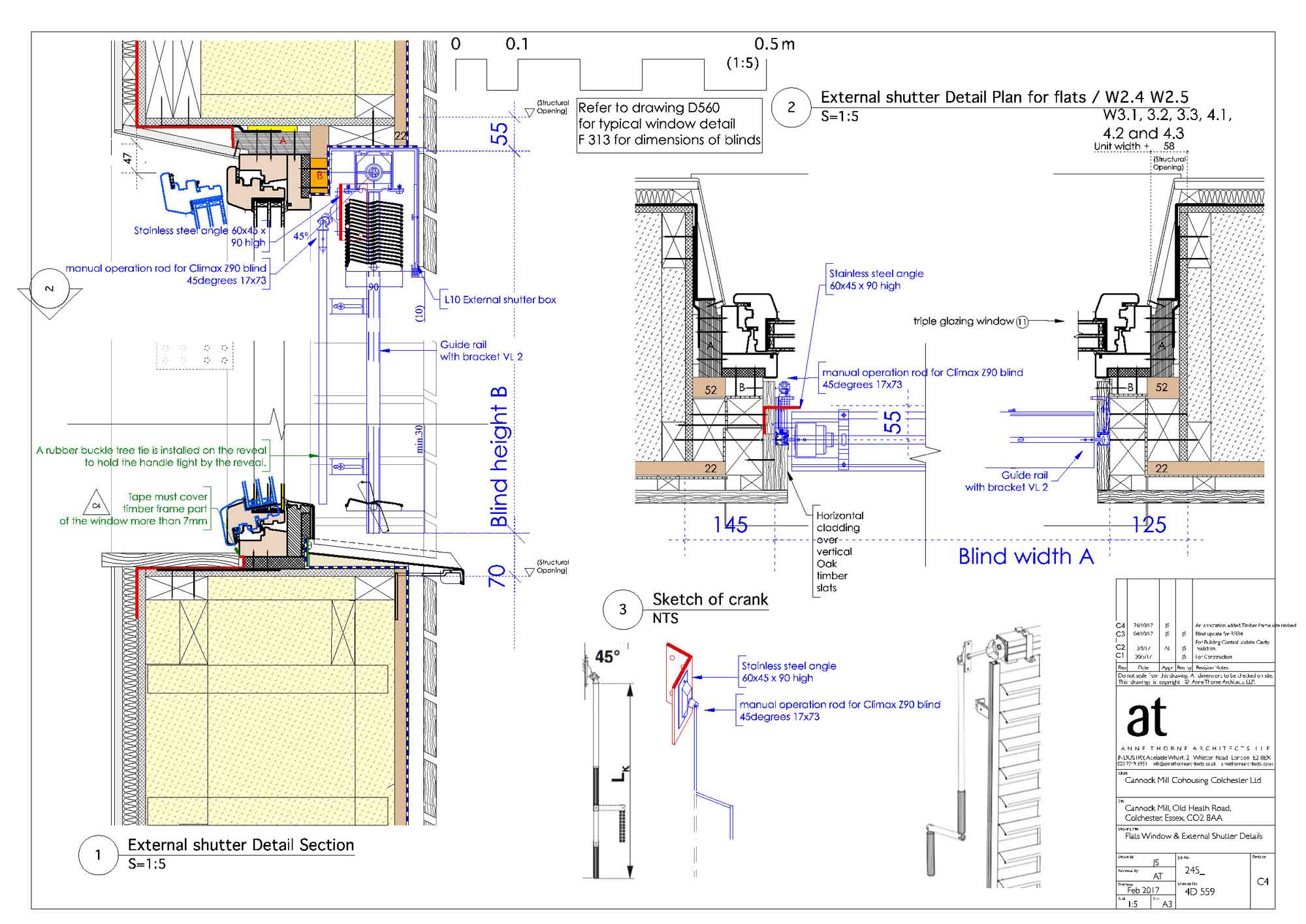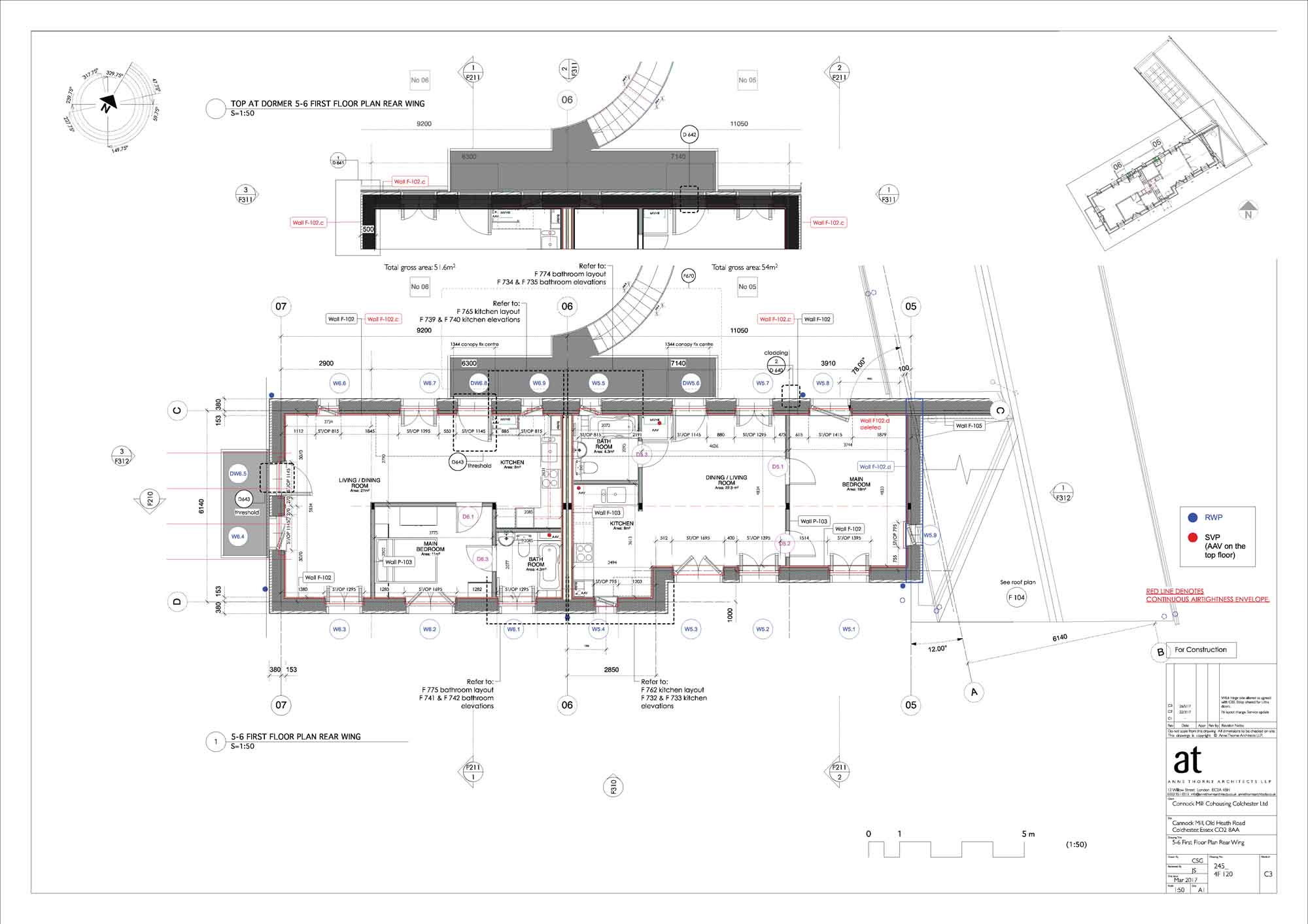 Walls (flats): 20 mm fire retardant treated European Oak cladding over insect mesh (flats) or zinc cladding on underlay and 18 mm WPB plywood externally, on 25 mm ventilation void, on Solitex Fronta Quattro membrane, on 22 mm wood fibre insulation, on 400 mm Warmcel cellulose insulation between structural timber frame and sub-frame, on 12 mm Smartply Propassiv airtight OSB, on 25 mm services zone insulated with Thermo Hemp Combi Jute, on plasterboard and paint finish. U-values: 0.092 W/ m2K (flats)