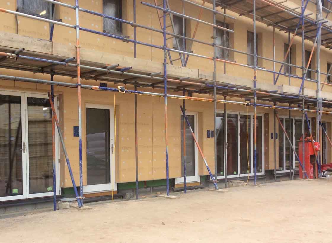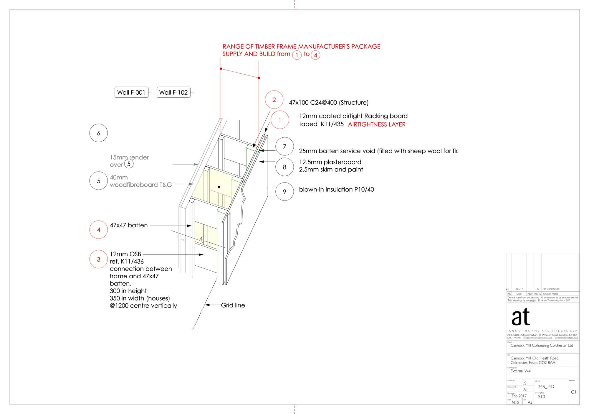 Walls (houses): Lime render on 40 mm Steico Protect wood fibre insulation, on 350 mm Warmcel cellulose insulation between structural timber frame and sub-frame, on 12 mm Smartply Propassiv OSB, on 25 mm service zone, on plasterboard and paint finish. U-value: 0.108 W/m2K