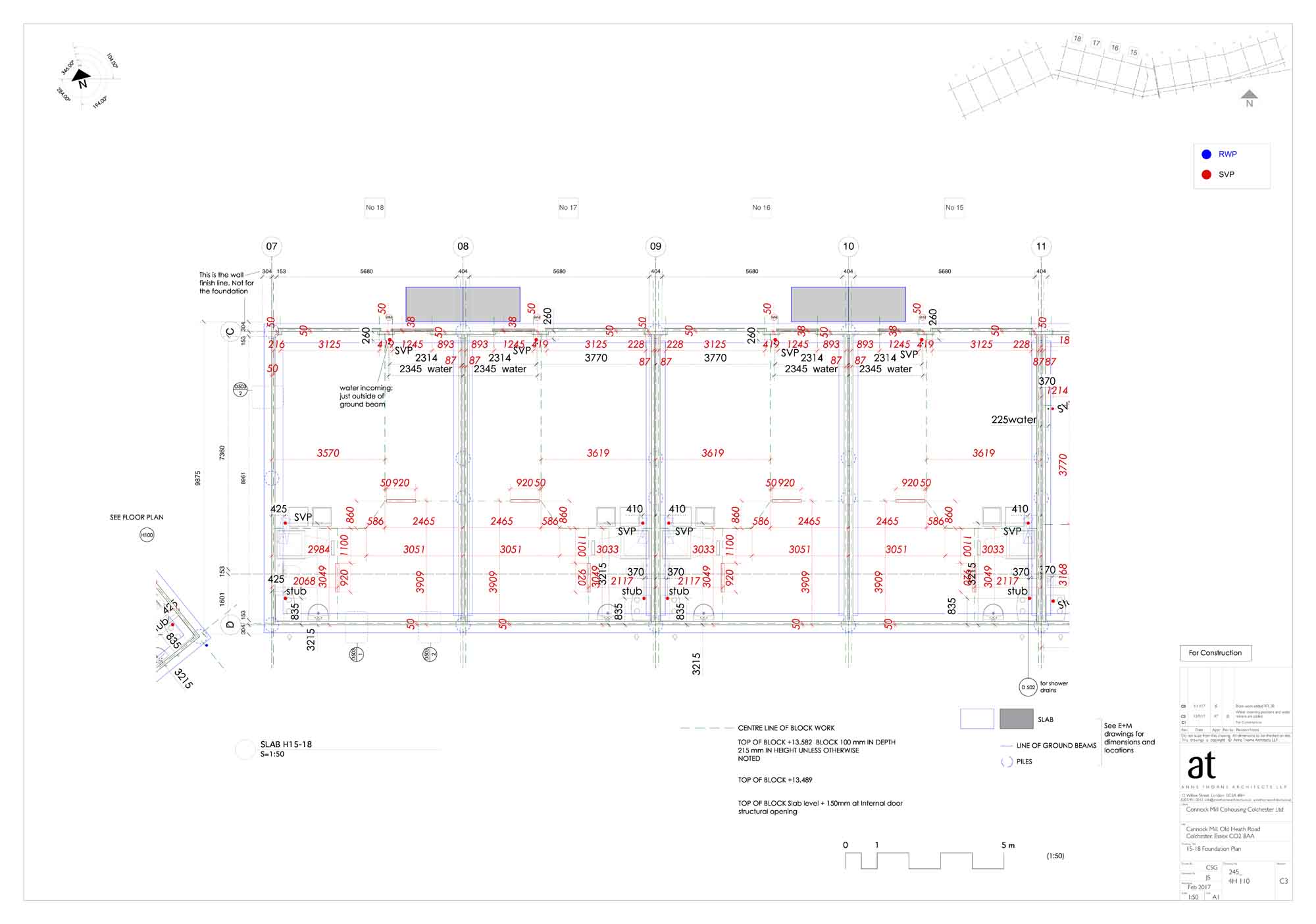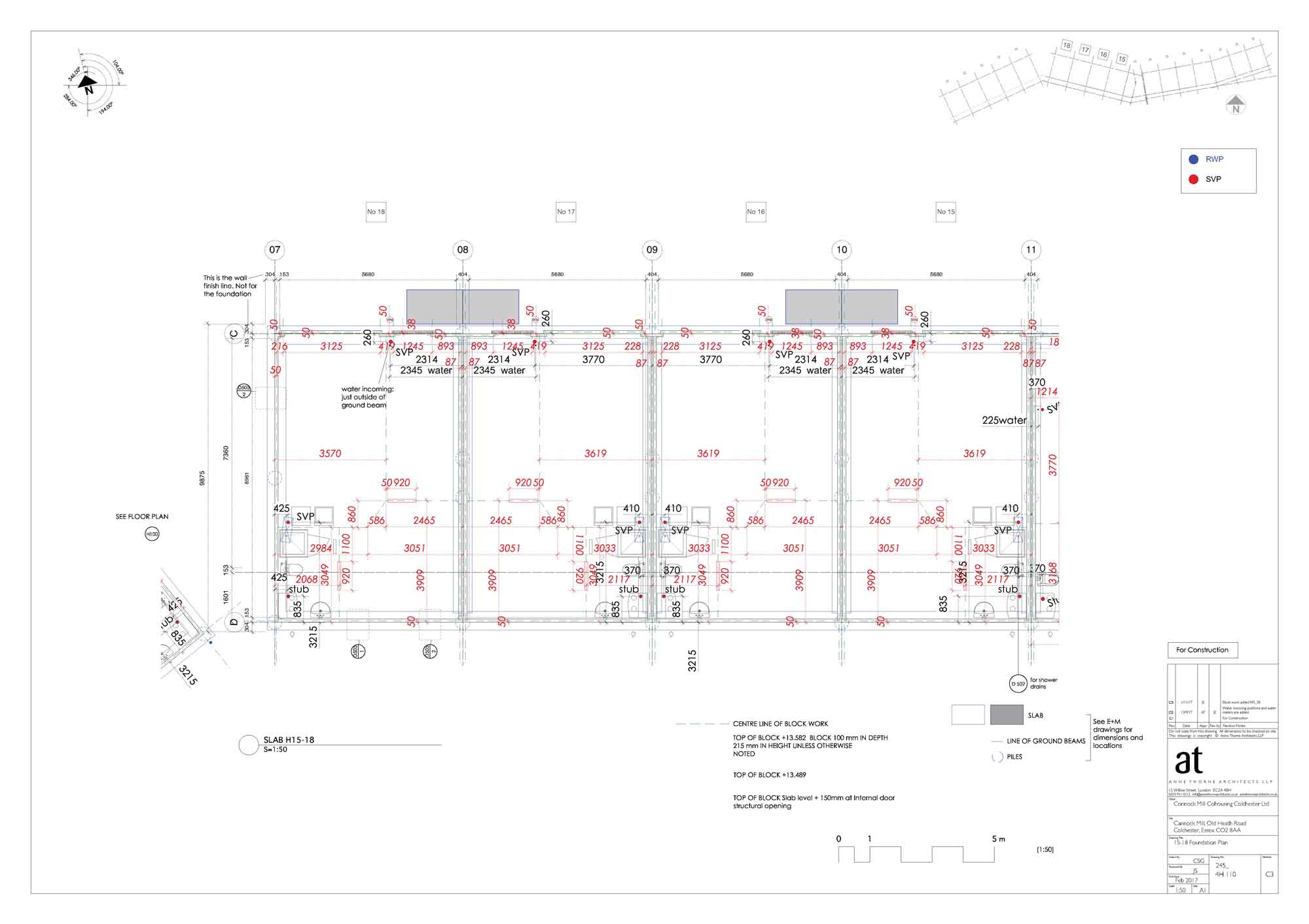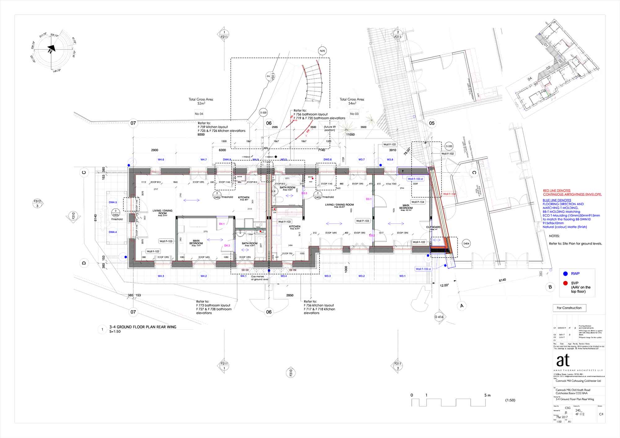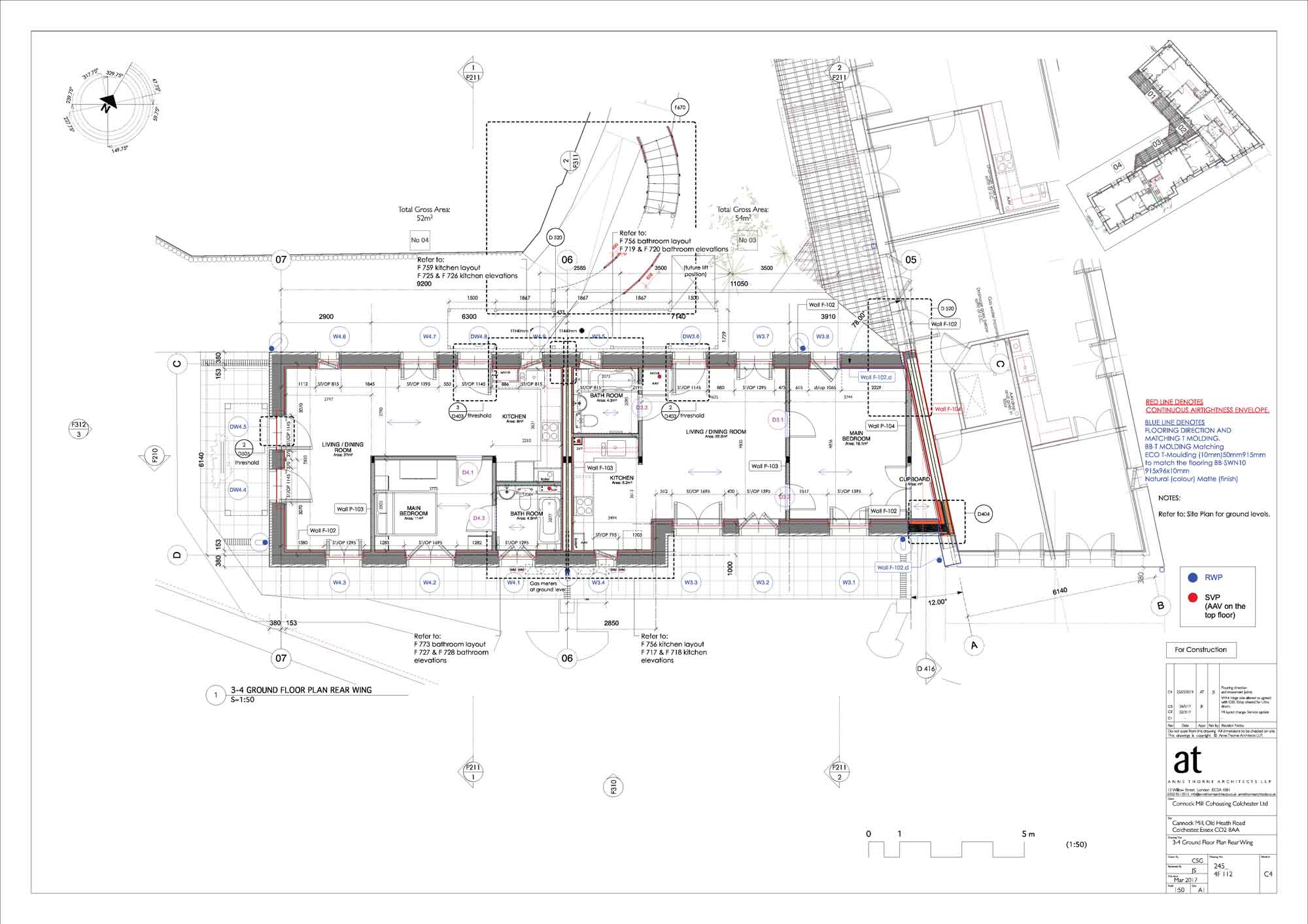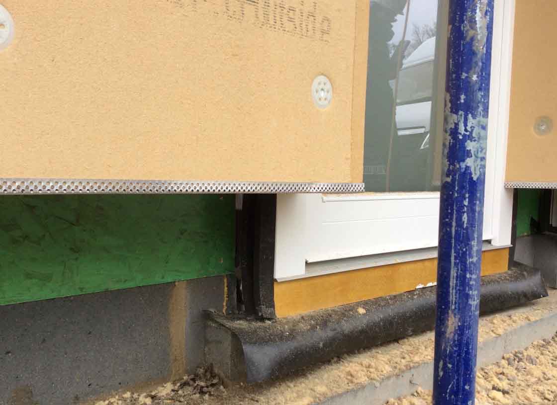 Thermal bridging: Ground wall junction: +0.023 W/mK. Achieved using one course of AAC block Airtec 7 lined with XPS insulation to the bottom of the wall. Floor insulation PIR is above the concrete slab and below screed. Threshold: 0.047 Wm/K with single AAC block Airtec 7 in line of door. Separating wall bottom: +0.08 W/mK using one course of AAC block Airtec 7. Floor insulation PIR is above the concrete slab and below screed. Balcony wall bottom: + 0.076 W/mK, separating the steel connection from the timber structure and the insulation zone.