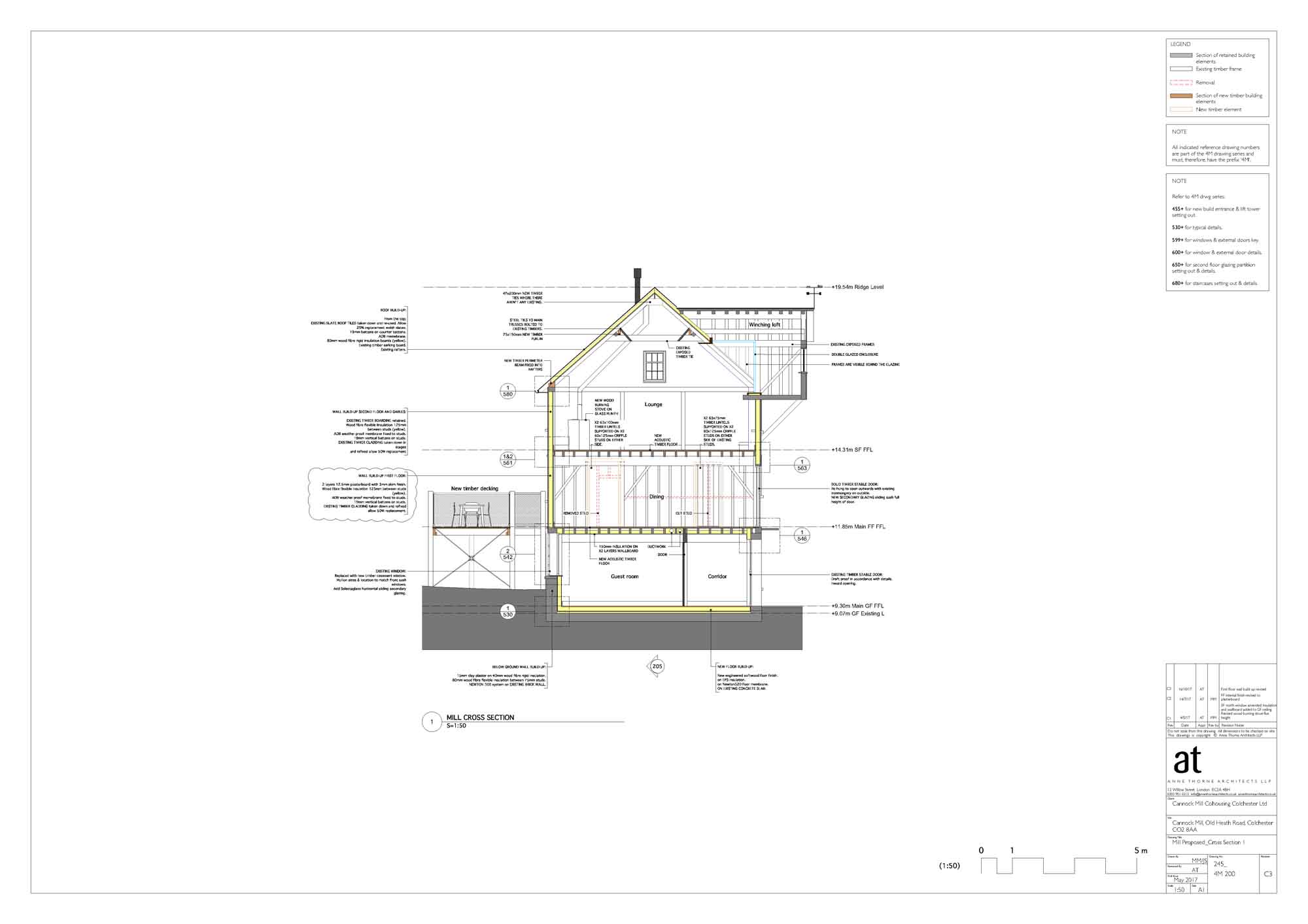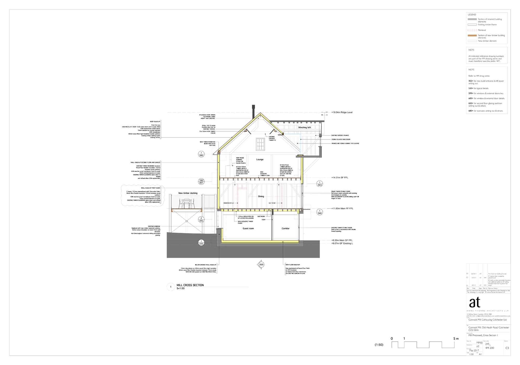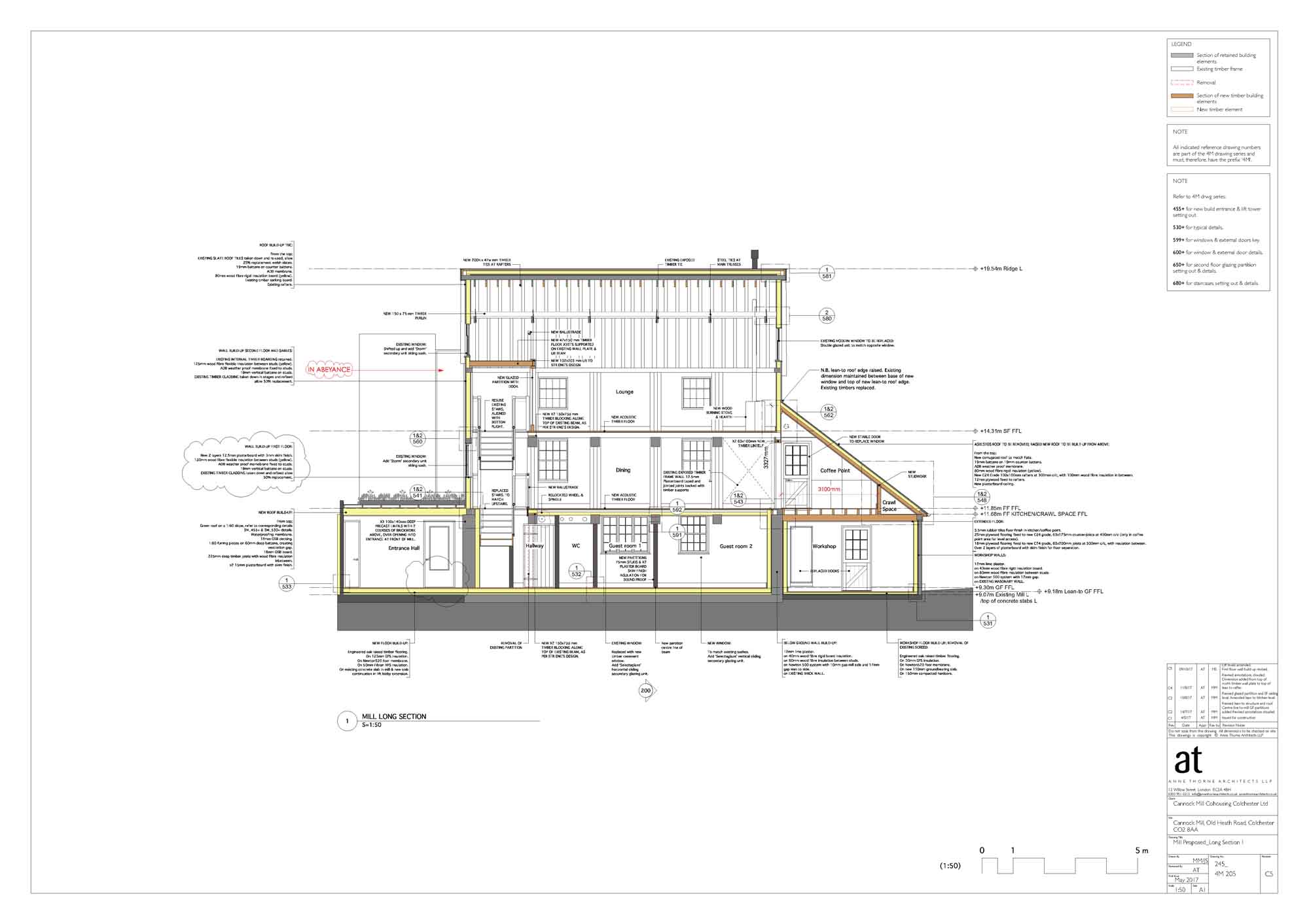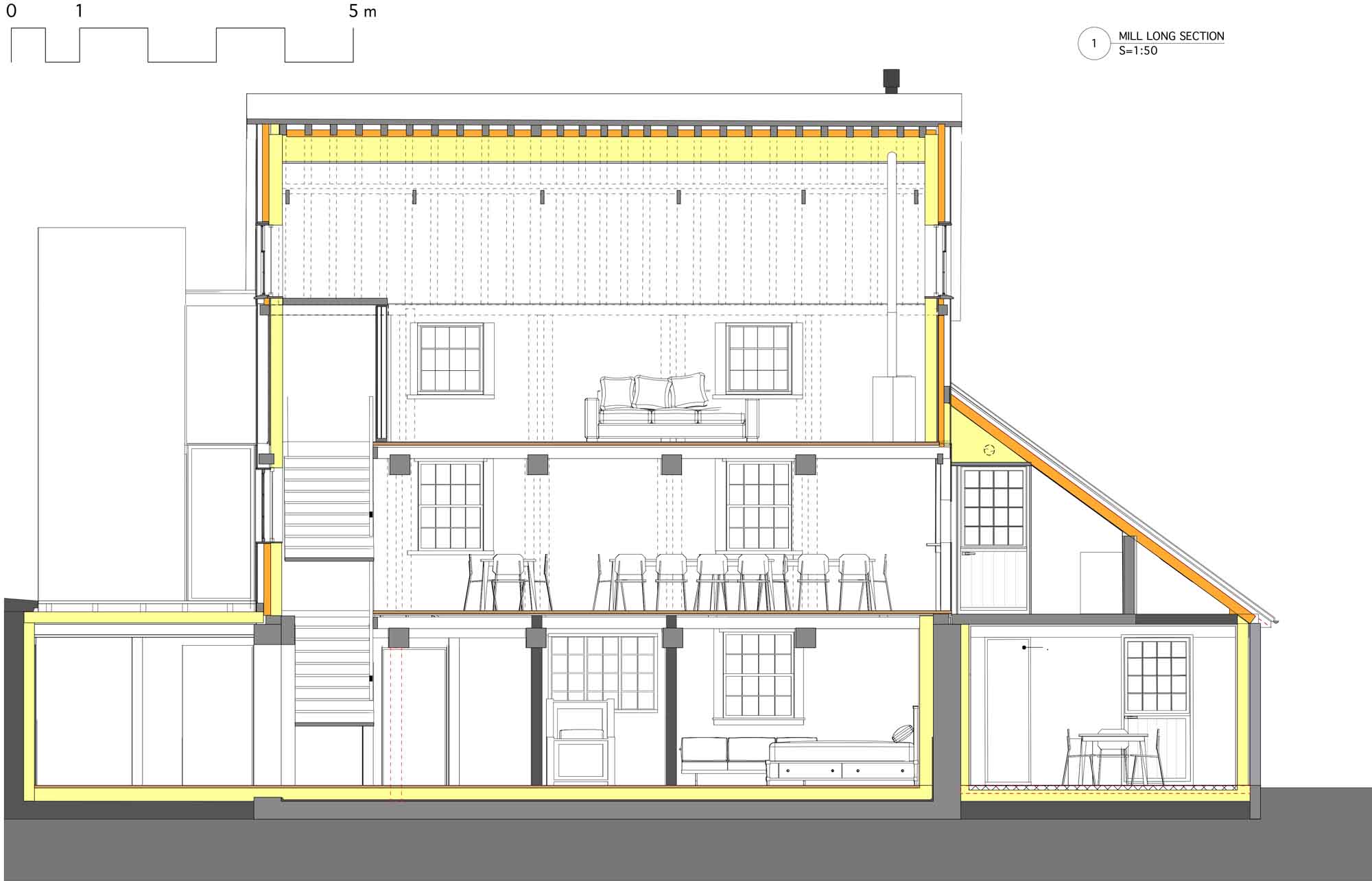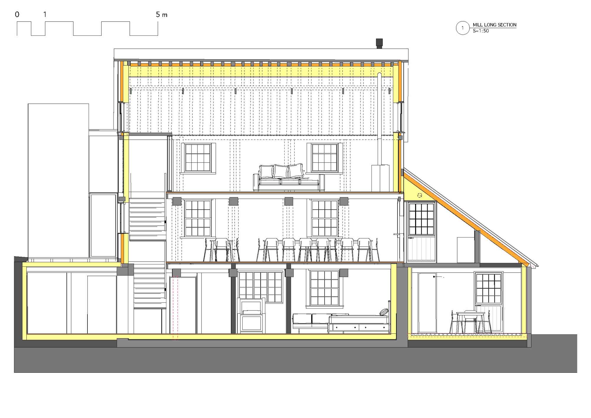 Building type: 23 homes — a mixture of one, two and three-bed houses and flats — across three buildings: 316 m2 (six-flat block), 655 m2 (five-house block) and 1,200 m2 (12-house block). Figures are treated floor areas. Gross internal floor area of dwellings ranges from 52 m2 to 144 m2. There is also a common house, in the existing listed mill building.