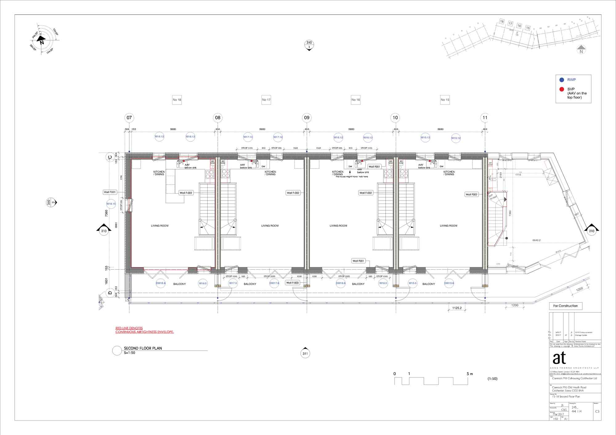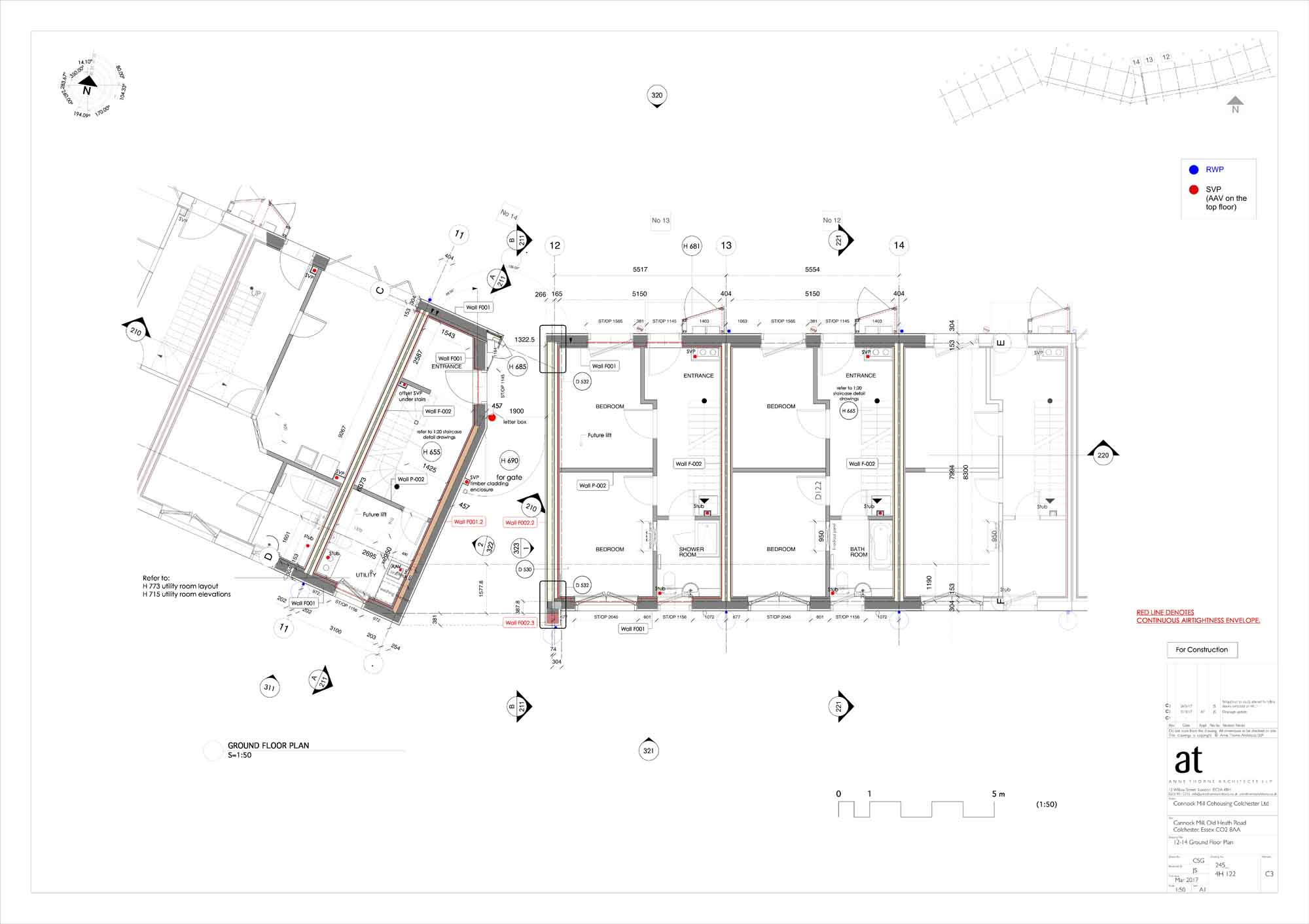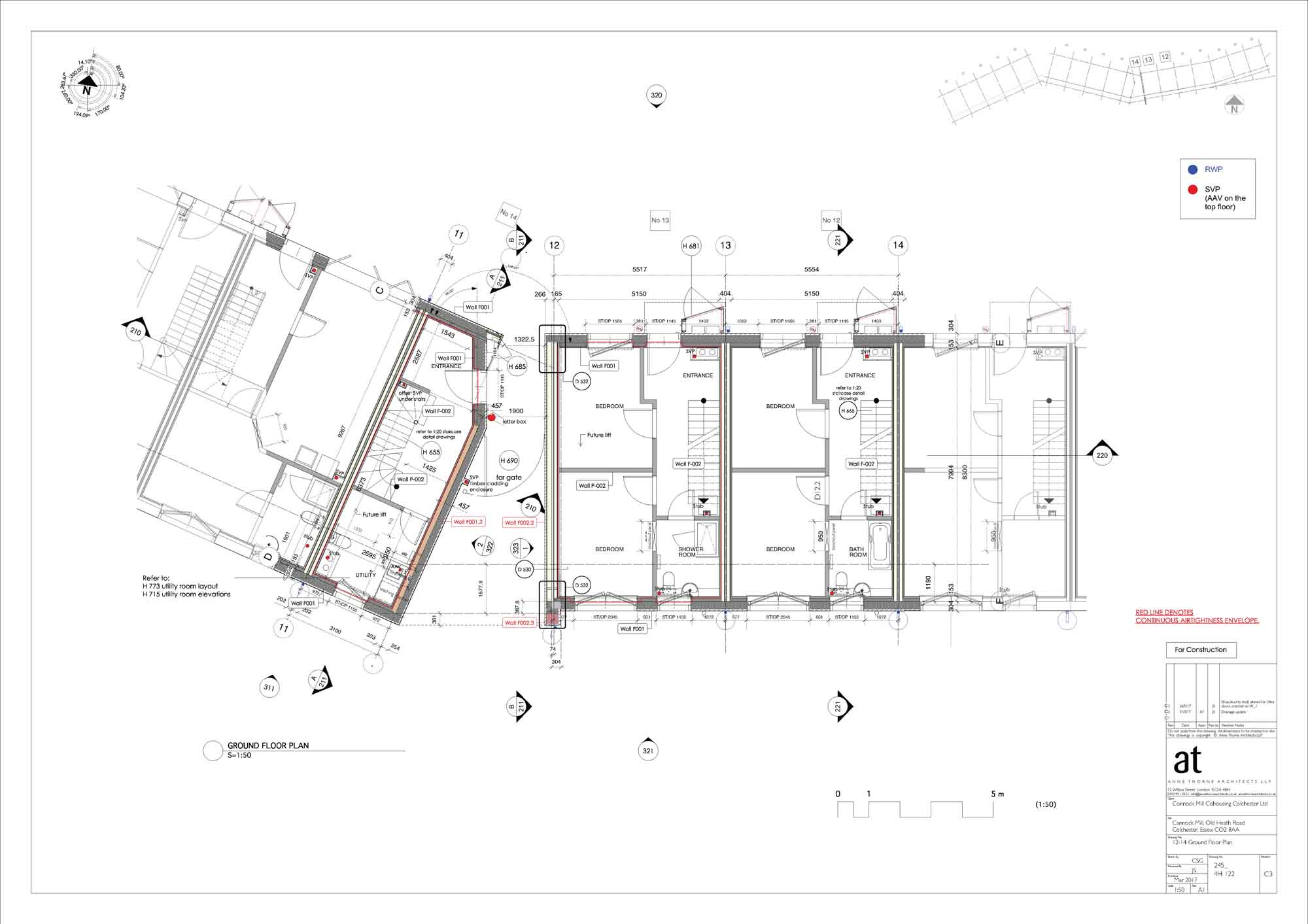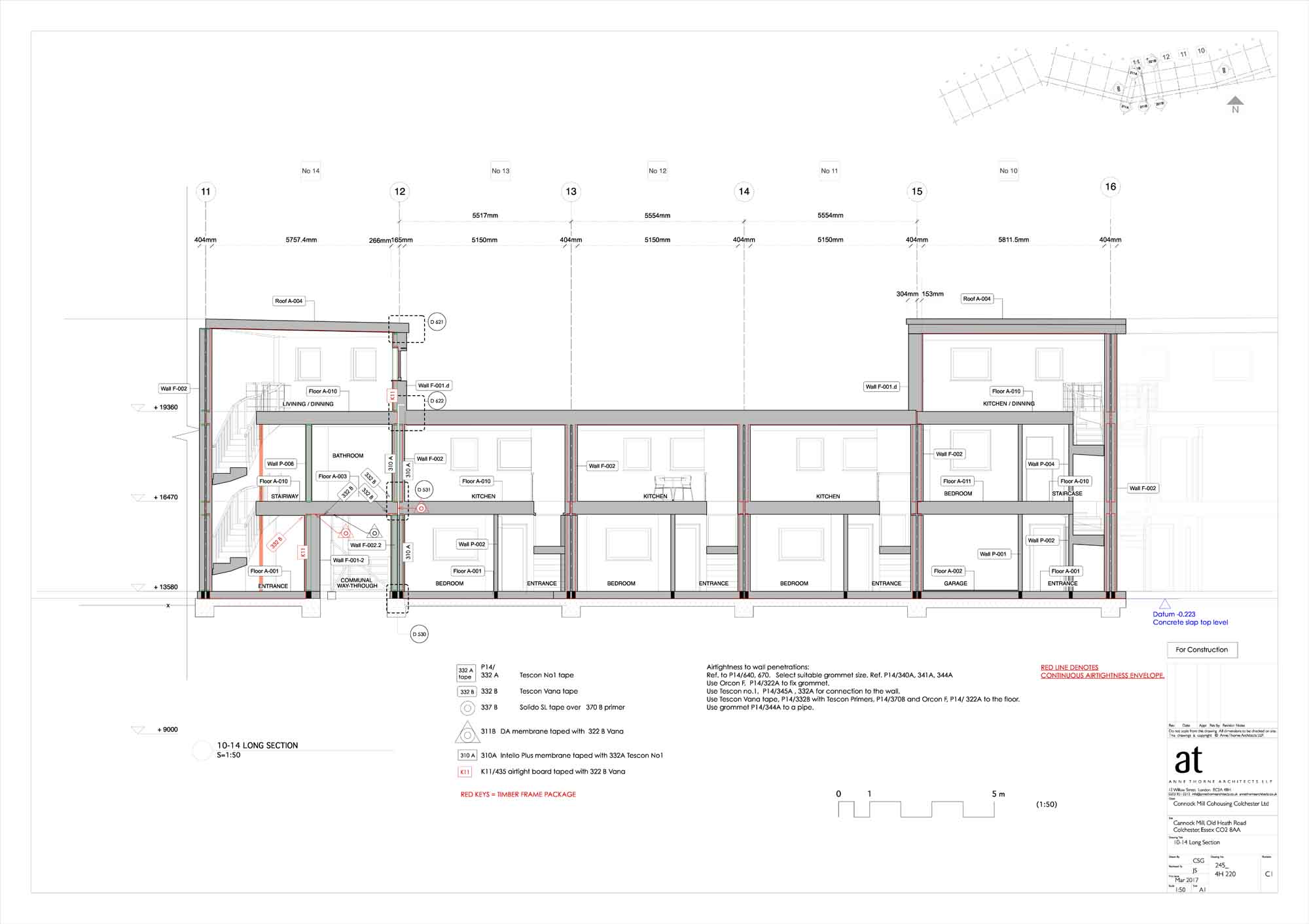 Airtightness (at 50 Pascals): Each dwelling was individually tested to be under 0.6 air changes per hour; for the purposes of passive house certification each of the three buildings was submitted at 0.6 ACH.