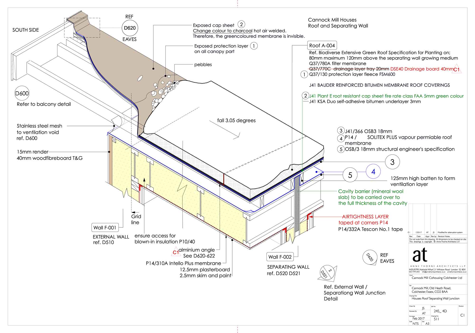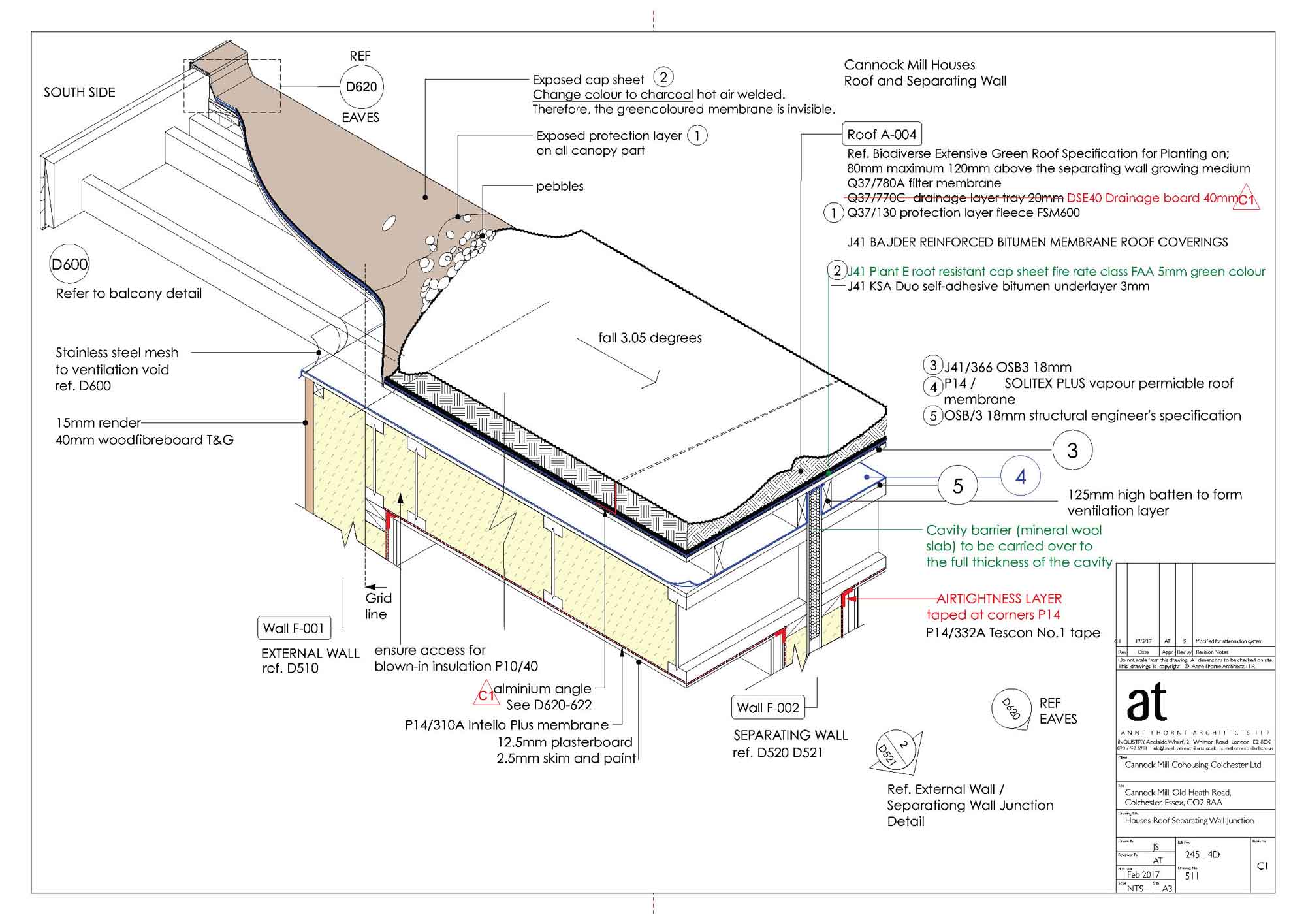 Roof (houses): Vegetation externally, followed underneath by 120 mm growing medium & drainage layers, on Bauder waterproof protection, on 18 mm OSB3, on 125 mm ventilation zone, on Solitex Plus membrane, on 18 mm OSB3, on 360 mm Warmcel cellulose insulation between 360 mm I-joists, on Intello Plus airtightness membrane, on 50 mm battens, on plasterboard and paint finish. U-Value: 0.111 W/m2K