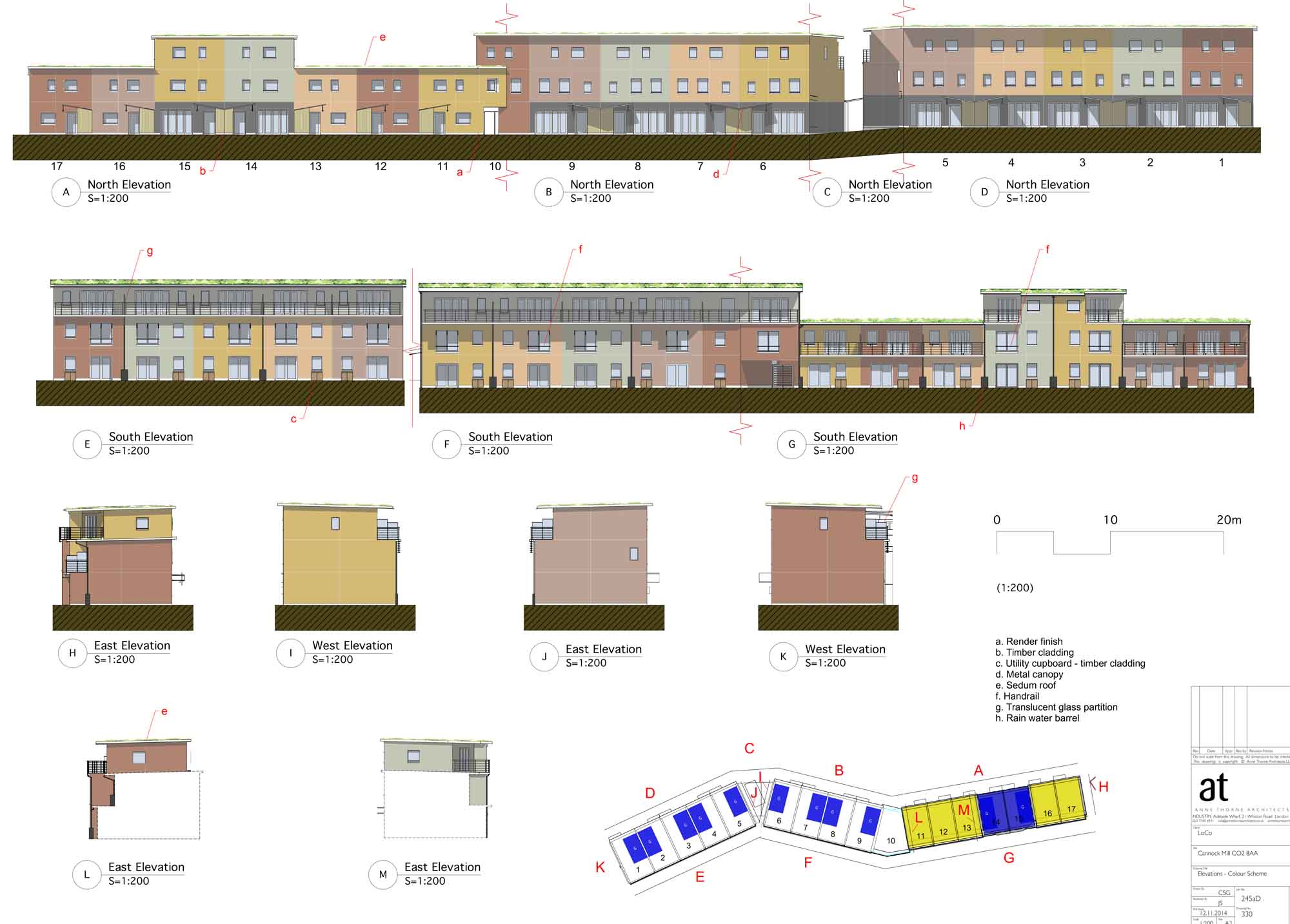 The houses have living green roofs and are constructed in timber frame cassettes with cellulose (recycled newspaper) insulation, wood fibre and sheep wool insulation, while the flooring is made from renewable bamboo. On the outside, the dwellings are finished with ‘self-coloured’ lime render in different natural mineral colours that won’t need to be repainted. They are designed to Lifetime Homes space standards, meaning they can be made accessible at any stage, for example with the installation of lifts, or stairlifts.