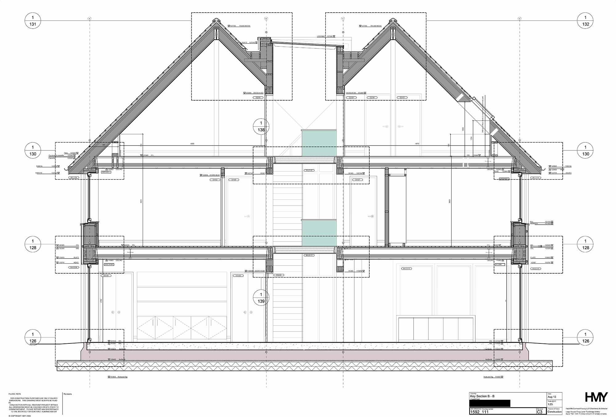 A pair of traditional pitched roof house forms were overlapped, creating a three dimensional Venn diagram, where the overlap is the central heart of the house: the entrance atrium and stair. This overlap is expressed externally with a full dimension roof light, which serves to bring warmth into the house in the wintertime.