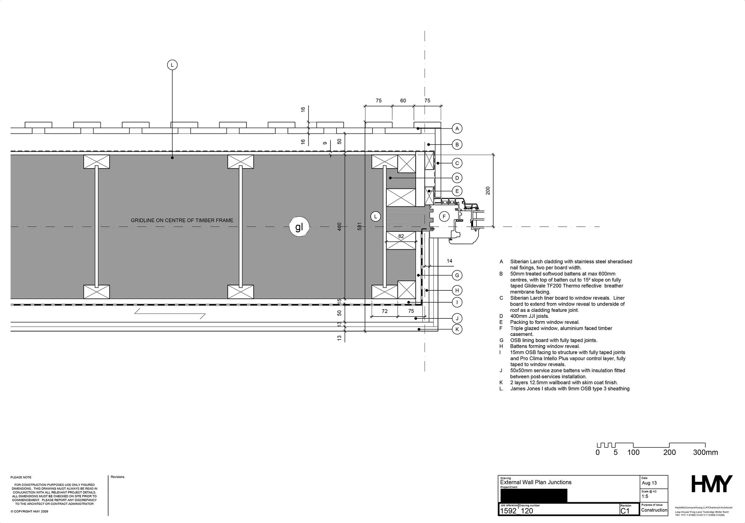 Walls: Factory-built timber frame with 22mm larch cladding externally, followed inside by 50x50mm treated battens, Protect TF200 windproof facade membrane, 9mm OSB board, 400mm Knauf Frametherm-filled I-joist timber stud, 15mm taped and sealed OSB-3, 50mm service cavity insulated with Knauf Frametherm insulation, and 12.5mm BG Gyproc Wallboard internally. U-value: 0.0.87 W/m2K