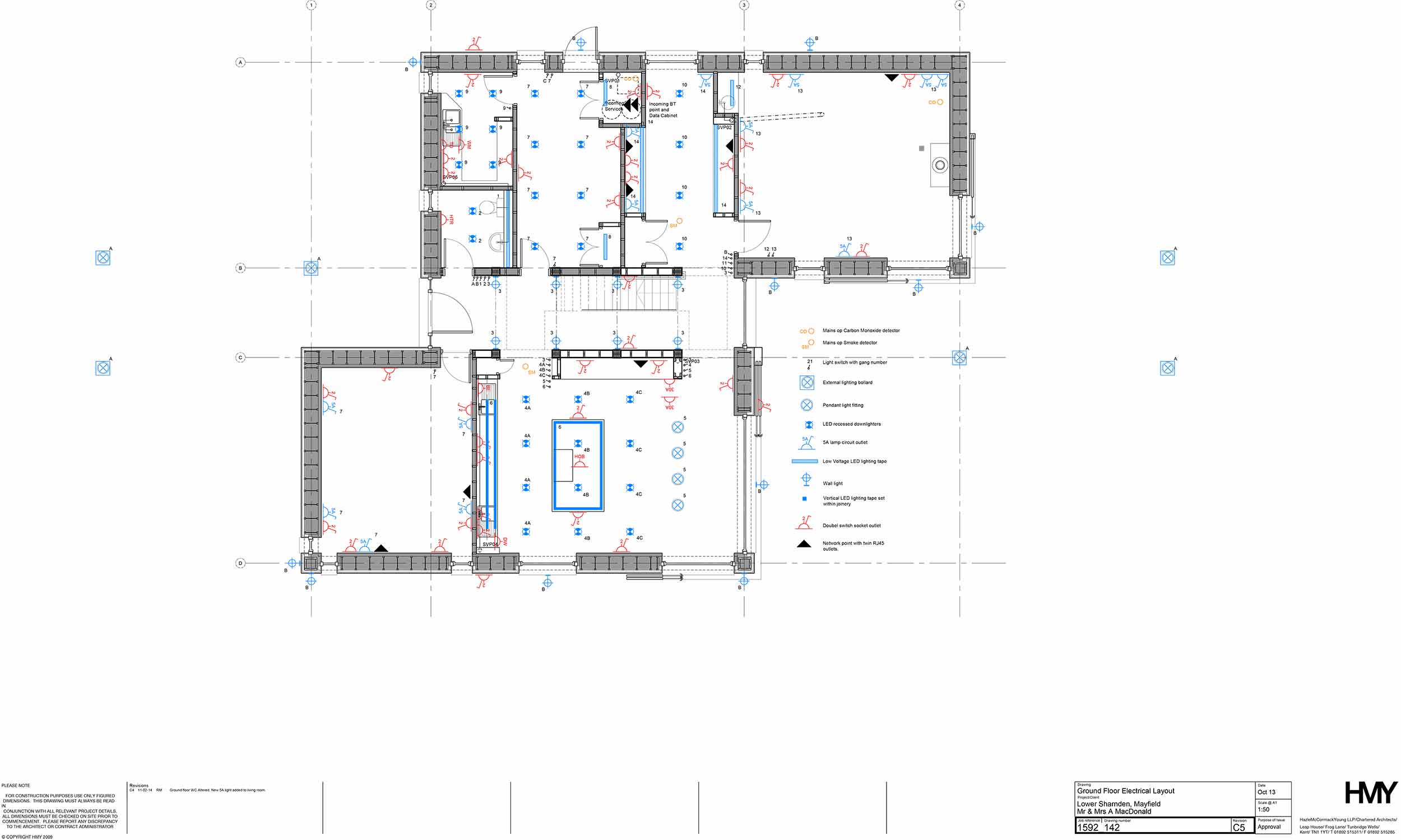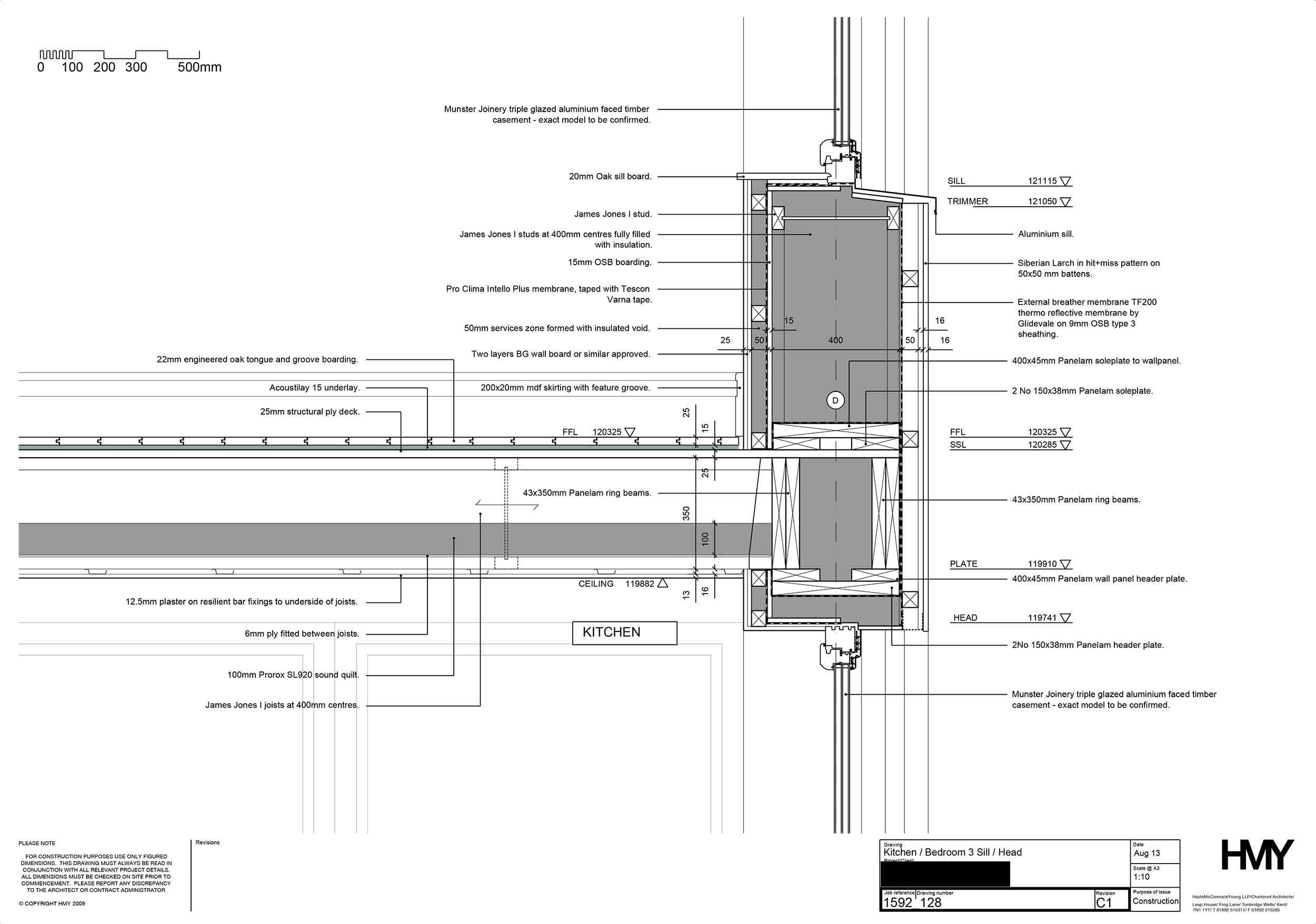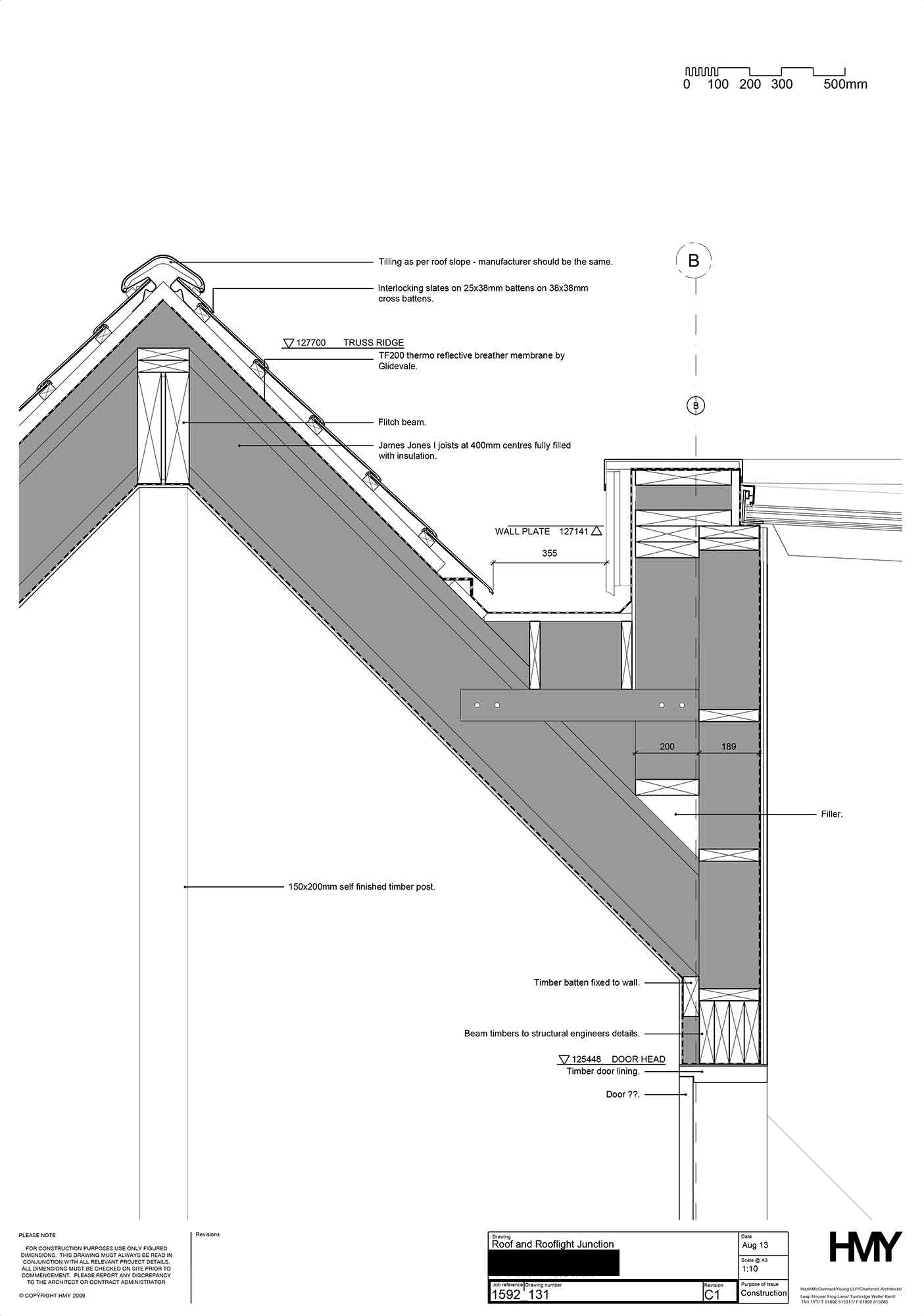 Roof: Fibre cement slates externally on 50x35 battens/counter battens, followed underneath by Protect TF200 breathable membrane, 400mm timber I-joists fully filled with Knauf Frametherm, 15mm taped & sealed Medite Smartply OSB-3, 50mm service cavity insulated with 50mm Celotex, 12.5mm plasterboard ceiling. U-value: 0.082 W/m2K