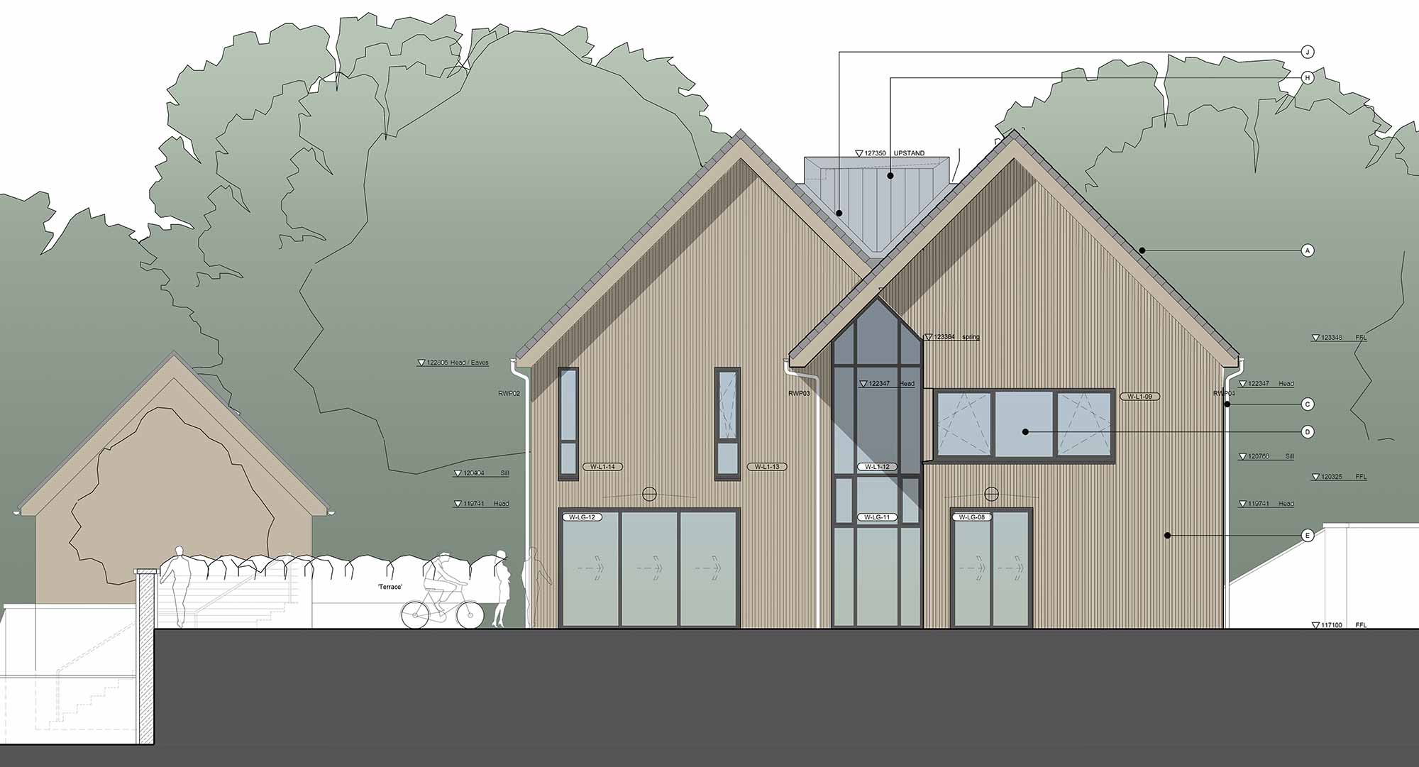 We also developed a wire structure to hang from the overhanging eaves which would support deciduous vine growth to prevent solar overheating in the summer, but would die back to allow welcome solar gain in the winter months. The ventilation design was carefully tweaked using PHPP with window opening sizes amended during the design process.
