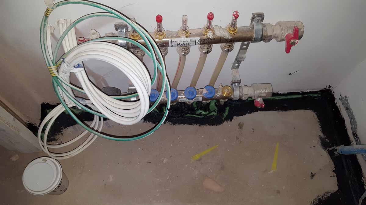 Xtratherm Thin-R insulation below and around edges of floor screed, and damp-proof membrane under this, which also serves as the airtightness layer here
