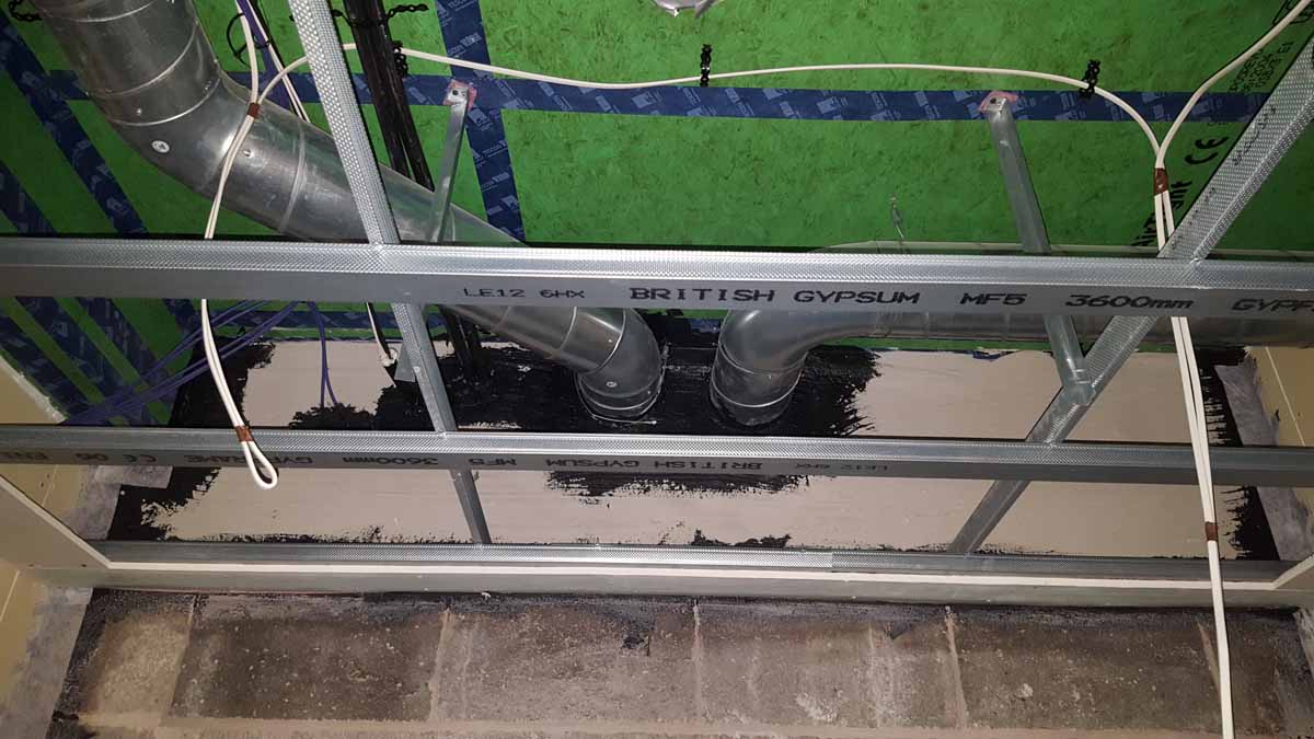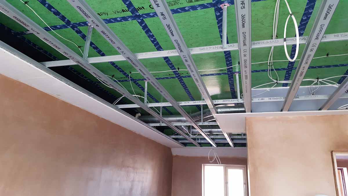 Taping of the ProPassiv board at underside of ceiling, with service cavity below this
