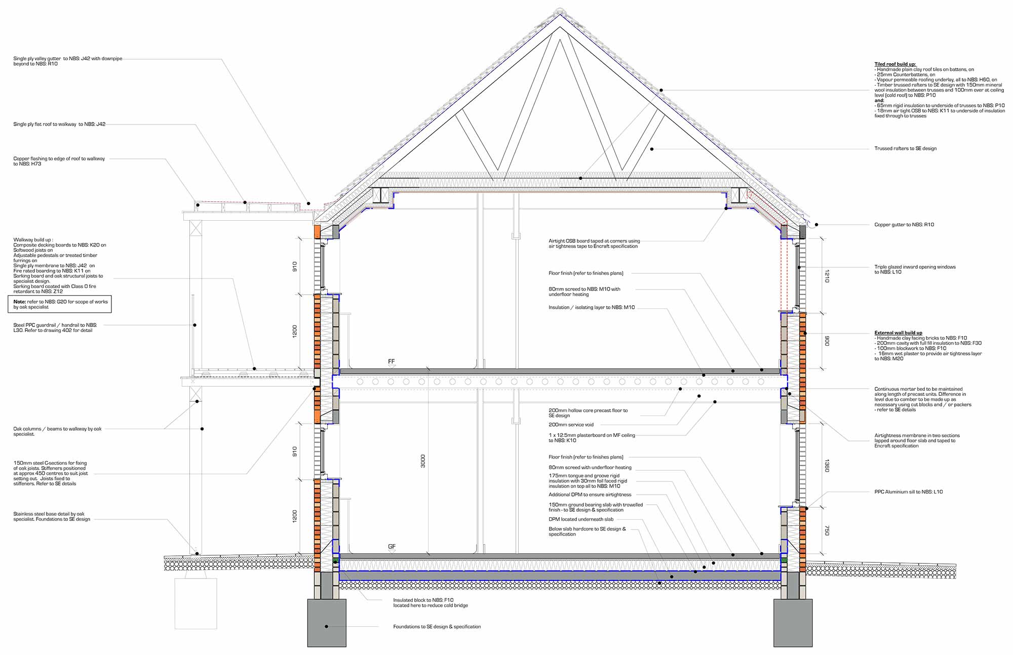 Wall build-up features brick outer leaf, followed inside by Isover mineral wool & Ancon TeploTie thermal wall ties in wall cavity, and Hemelite block internally
