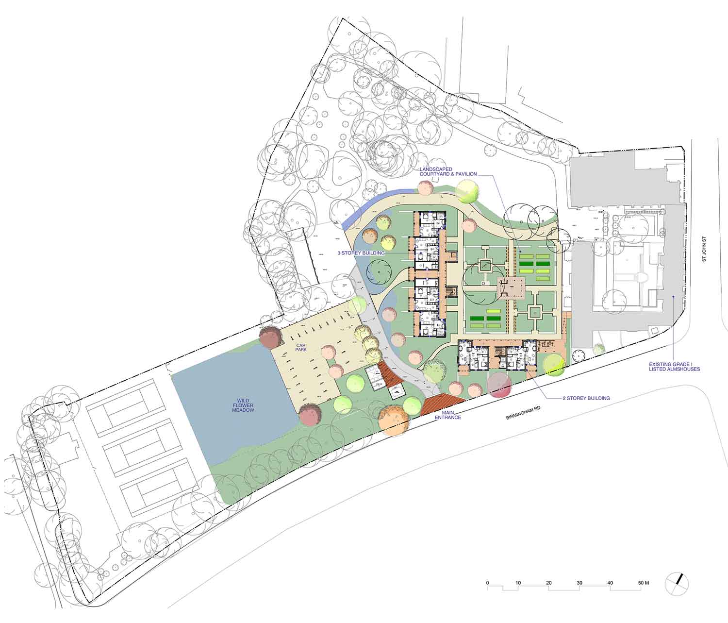 The new development that adds to the historic St John’s Almshouse complex provides for 18 new apartments contained within three separate buildings, which are arranged around a new landscaped courtyard. They were designed to create a second quadrangle that mirrored the existing quadrangle, which contains the original grade-one listed almshouse that was built in the late 15th Century.