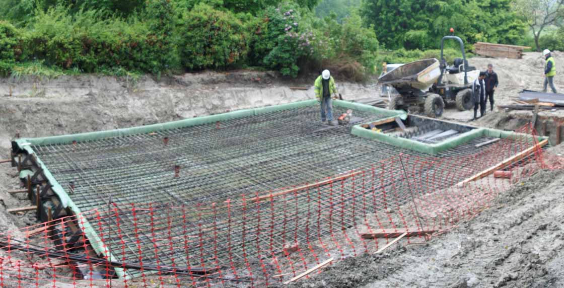 Lower ground floor (buried retaining wall): 360 mm exterior foamed glass insulation on waterproof membrane, on 250 mm 50 per cent GGBS concrete basement retaining structure. U-value: 0.107 W/m2K