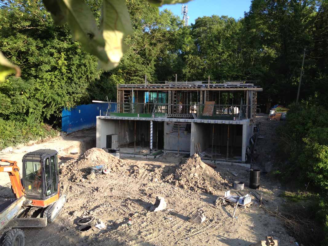 The mixed-construction house features a 50 % GGBS concrete structure on the lower floor, with a prefabricated timber frame upper floor