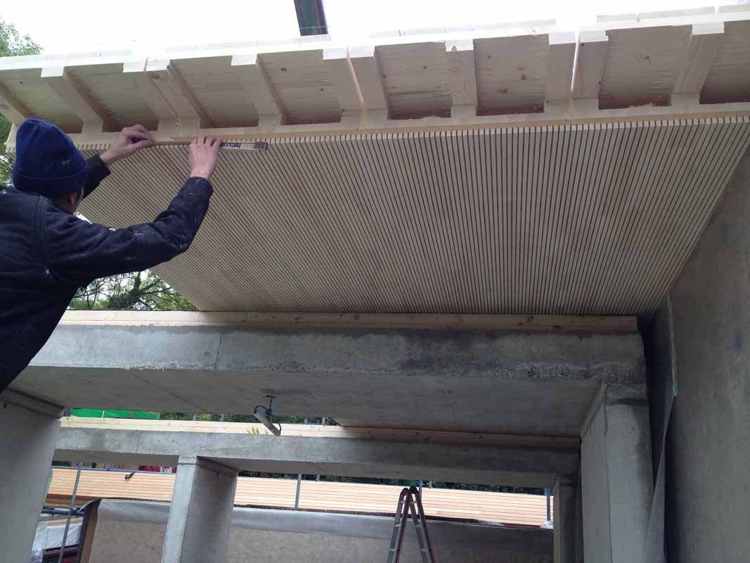 Lower ground floor (exposed): Austrian larch cladding externally with 360 mm wood fibre insulation on 250 mm 50 per cent GGBS concrete structure. U-value: 0.118 W/m2K