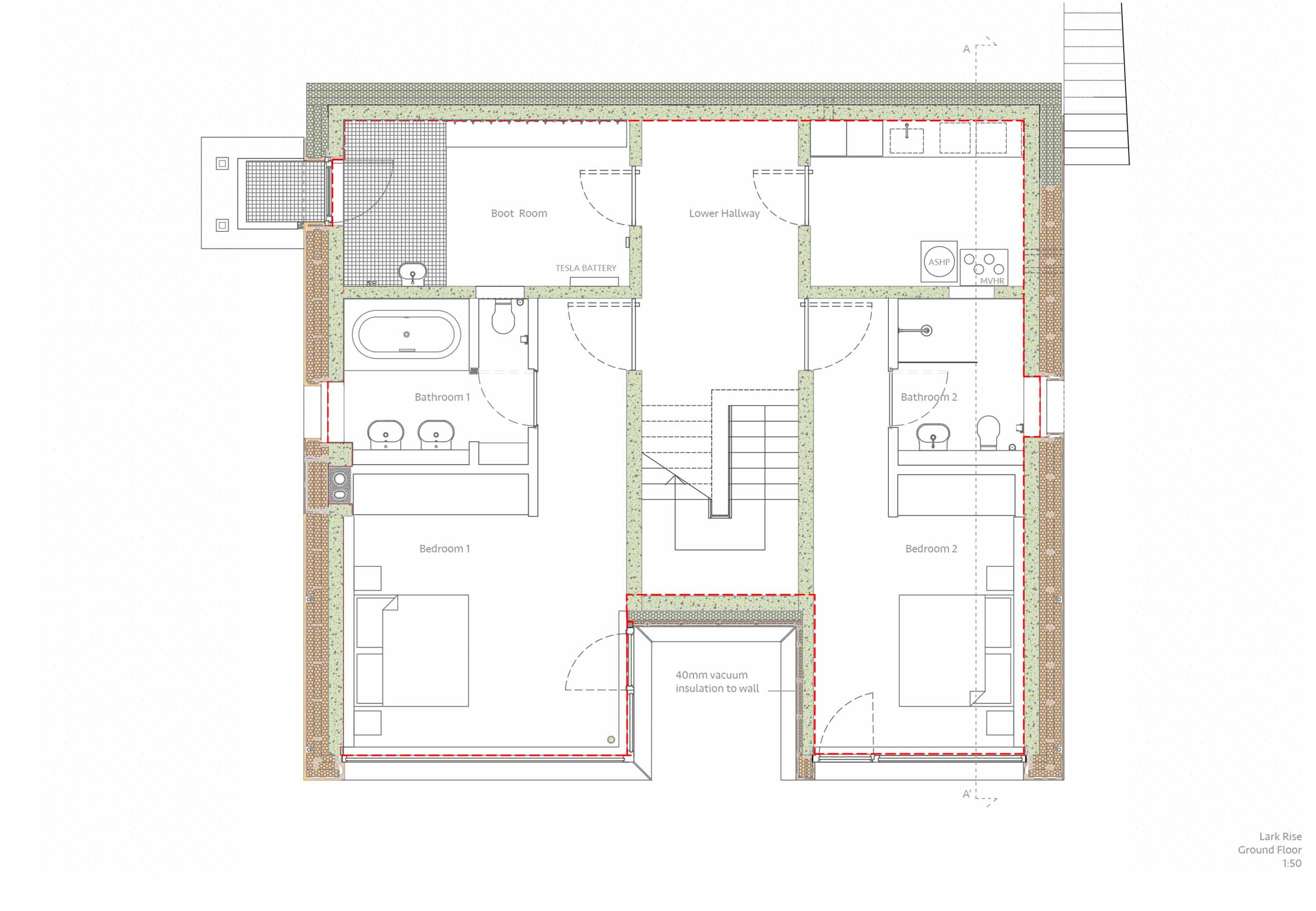 1. Potential for more than 80 per cent reduction in peak demand of electricity per home, compared to a conventional home or classic passive house. This is because peak electricity demand, usually early evening on a winter’s day, can be supplied by the battery to avoid contributing to a spike on the grid; this can be derived from a base level of retained electricity storage, or by pre-charging from a flood of excess renewable energy.