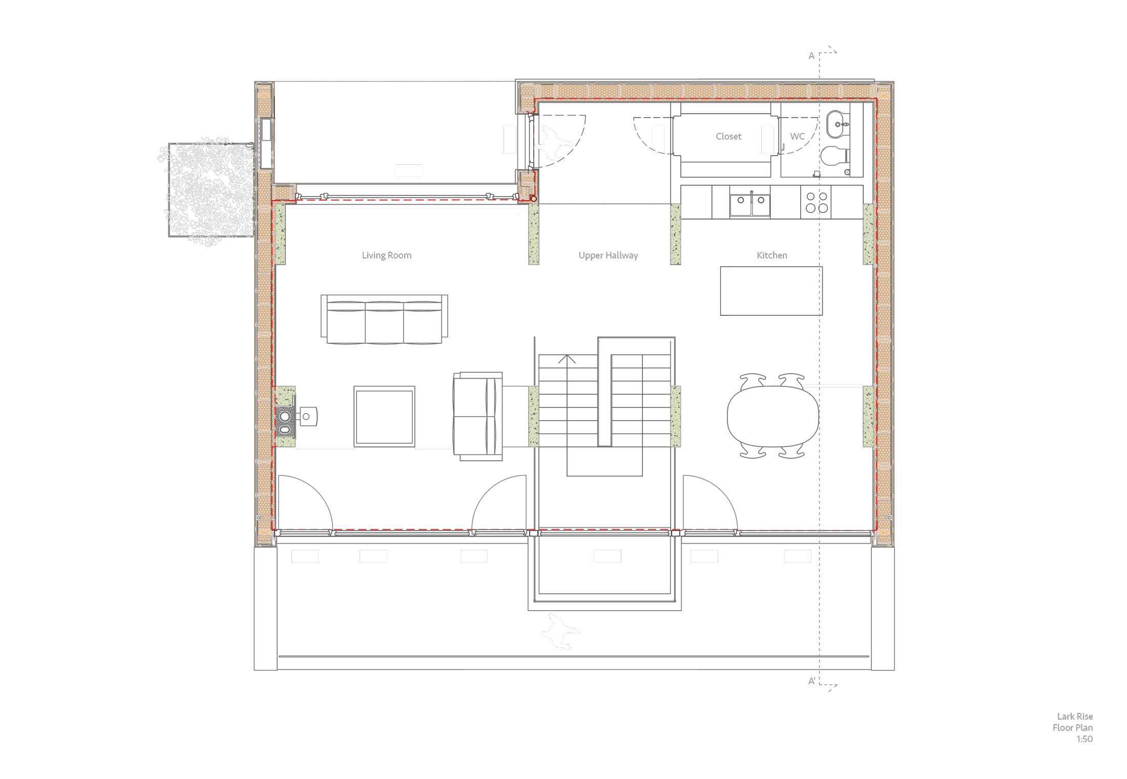 Lark Rise is a split-level dwelling in rural Buckinghamshire, designed by bere:architects and certified to the passive house plus standard. It is of timber frame construction resting on concrete ground floor walls, part of which serve as a retaining wall.