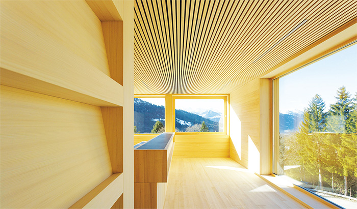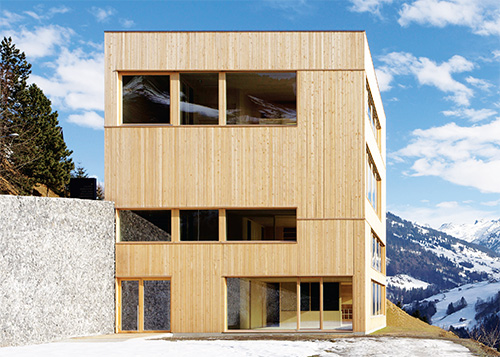 The form of the building references the neighbouring schoolhouse, which is a protected structure, and the local church too. Sited at the entrance to the village, the new building acts as a gateway to this remote community. It's also the first four-storey timber building in Vorarlberg, Austria's westernmost state.