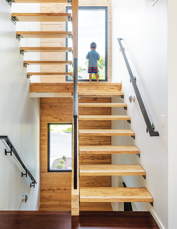 The home’s vaulted ceilings connect the main living area to an upstairs play area, while the daylit open staircase showcases wall panelling from a tree salvaged from the site.