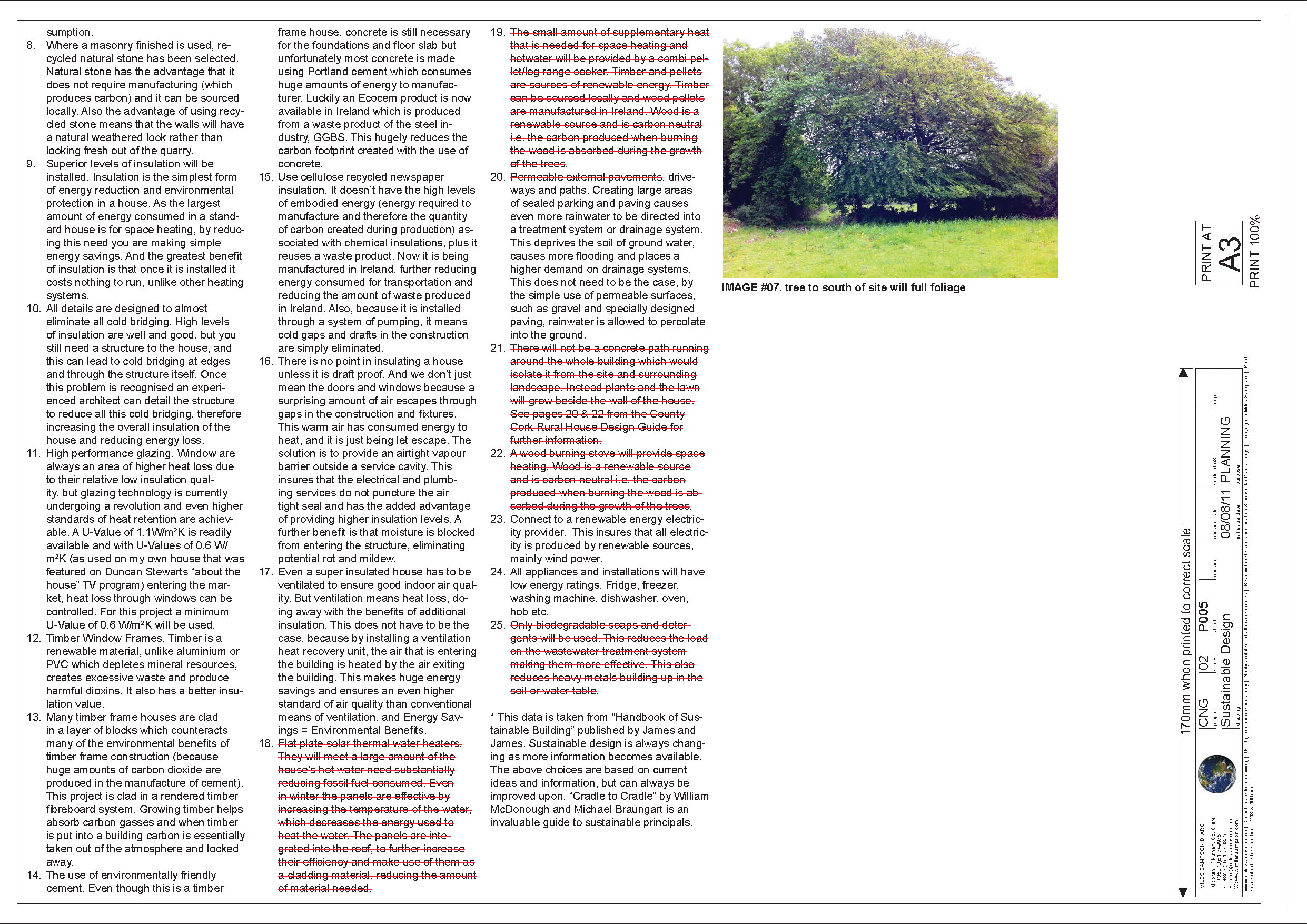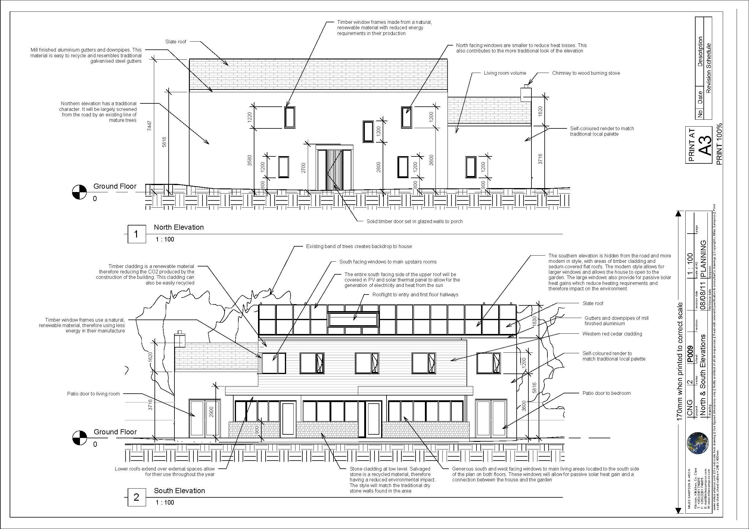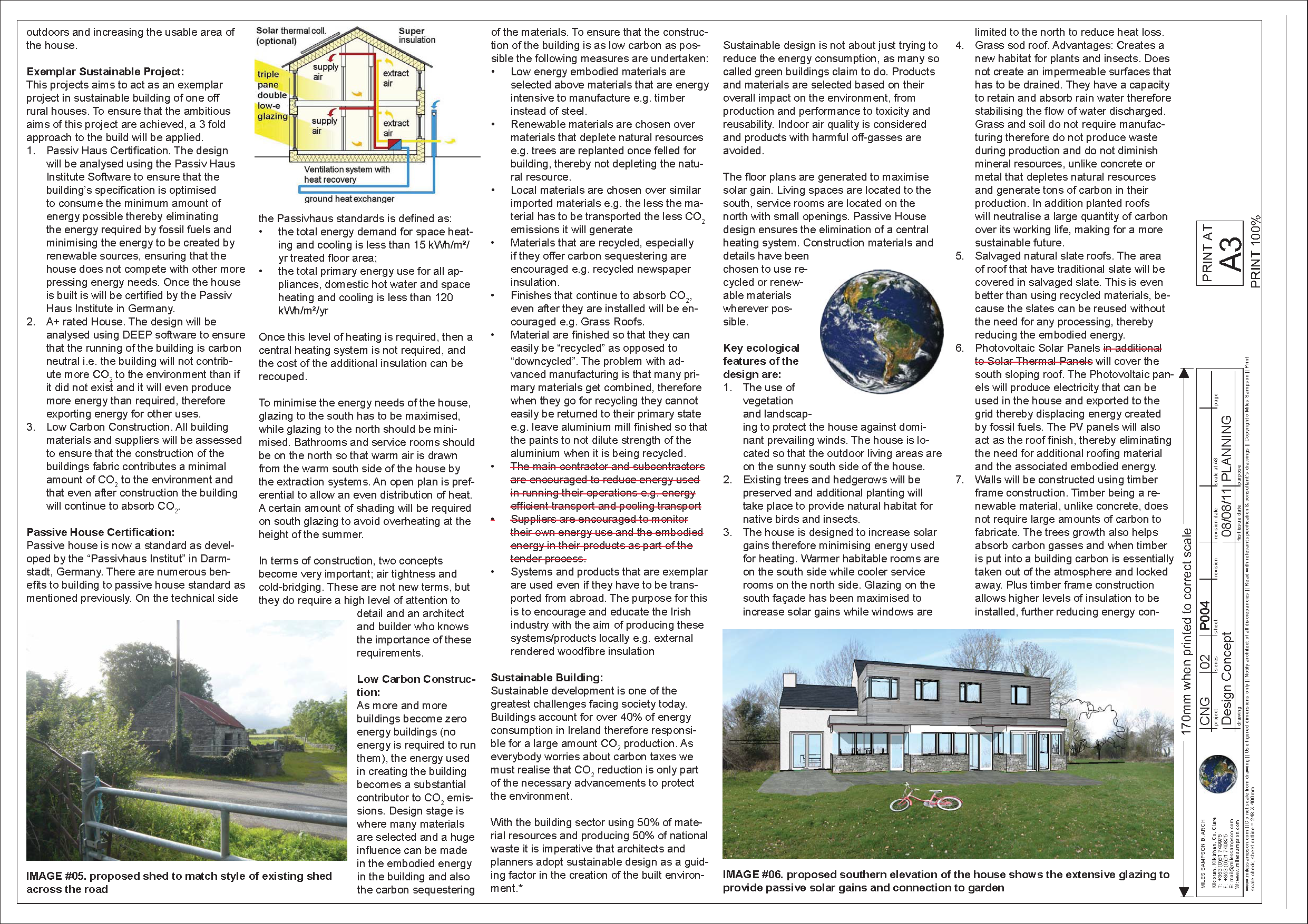 Green materials: Timber frame, MGO dry lining board, salvaged slate, cellulose insulation, wood fibre insulation, salvaged stone, GGBS cement (50% in slab, 25% in screeds), sheep wool carpets, cedar cladding, all-timber windows, sedum roof still to be fitted.