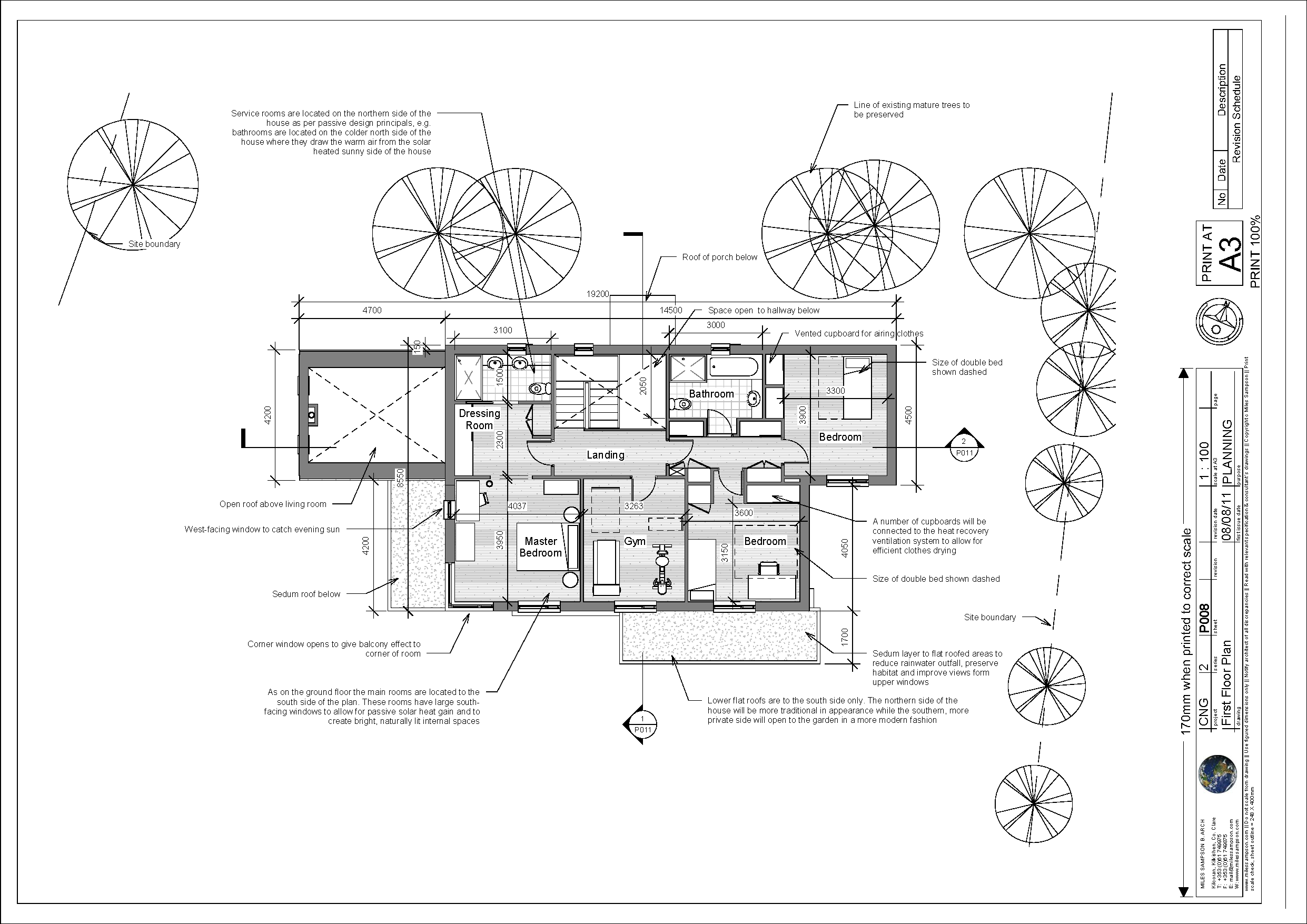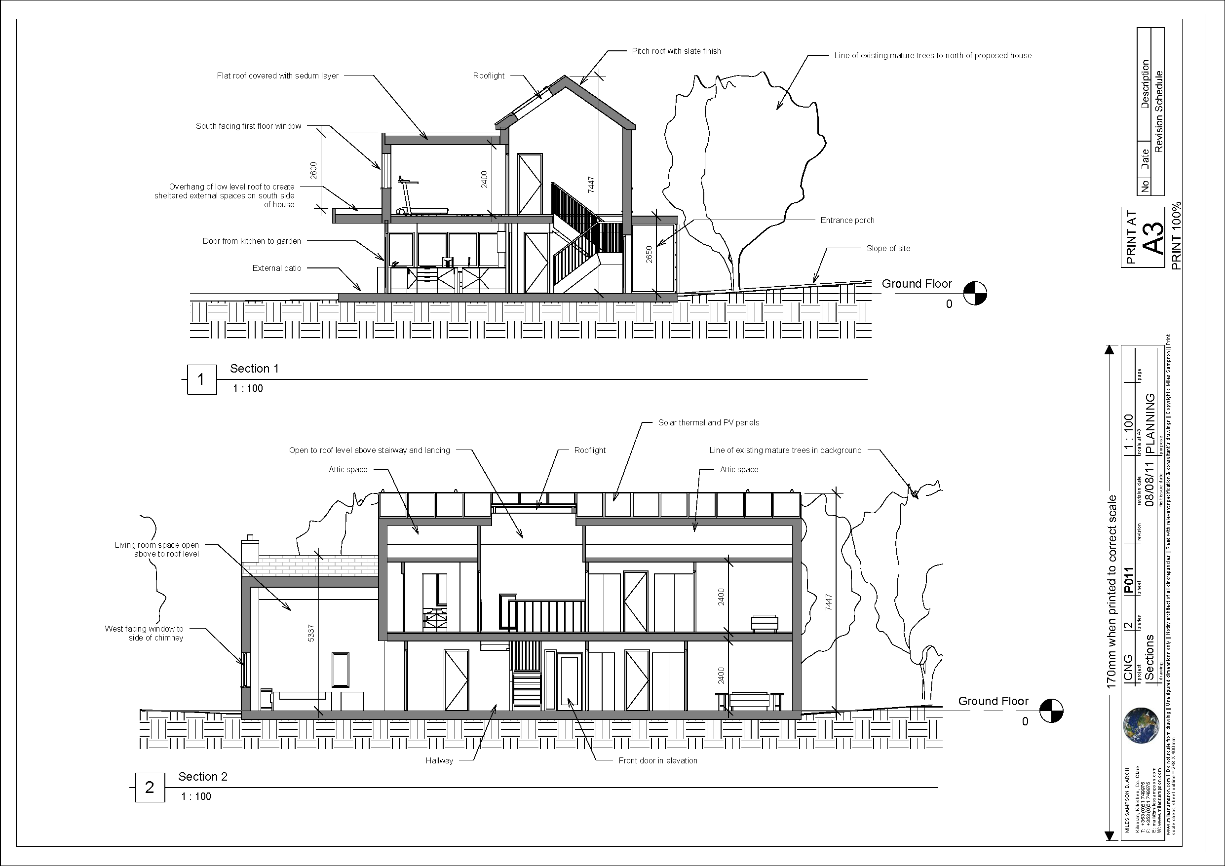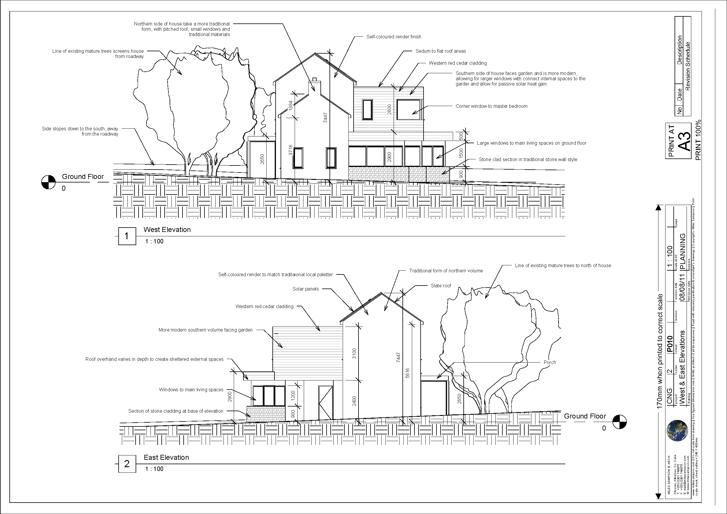 Staying with solar power, Sampson was able to position the house to make maximum use of passive solar gains, while still retaining the mature trees. The back of the house faces south, and features a stepped profile to ensure that kitchen, dining room, sitting room and playroom all get equal sun. This elevation has a modern feel, with lots of glazing, while the north-facing front of the house has a far more traditional design, with small, dispersed windows looking onto the public road.