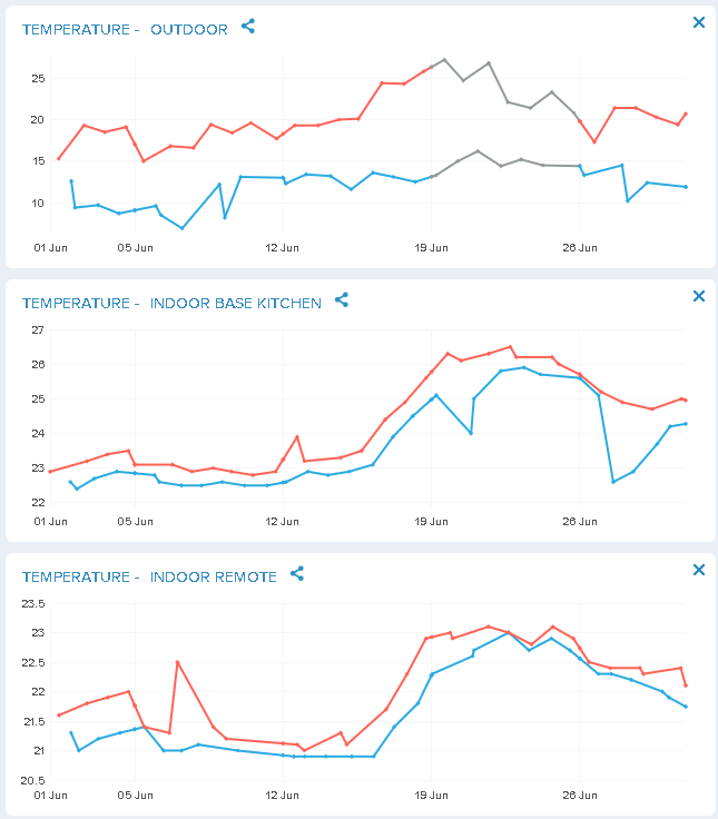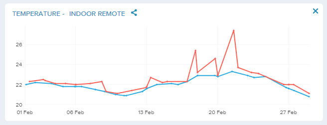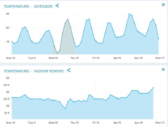 While technical difficulties have interrupted monitoring, there is a complete set of data available for February 2017. One of the monitoring modules, located in the highly-insulated but little-glazed northern part of the house, shows indoor temperatures remaining remarkably even at around 22C, with little difference between maximum and minimum daily temperatures, bar a couple of spikes — the largest of which came on Feb 22, though the clients cannot recall exactly what might have caused this.