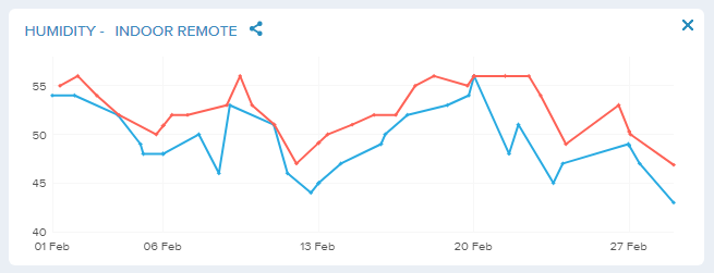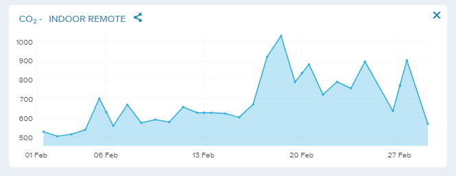 Relative humidity generally remained between 45% and 55% (40% to 60% being the recommended indoor range), with CO2 ranging between 500 and 900 parts per million, suggesting good indoor air quality. CO2 only peaked over 1,000ppm on February 22.