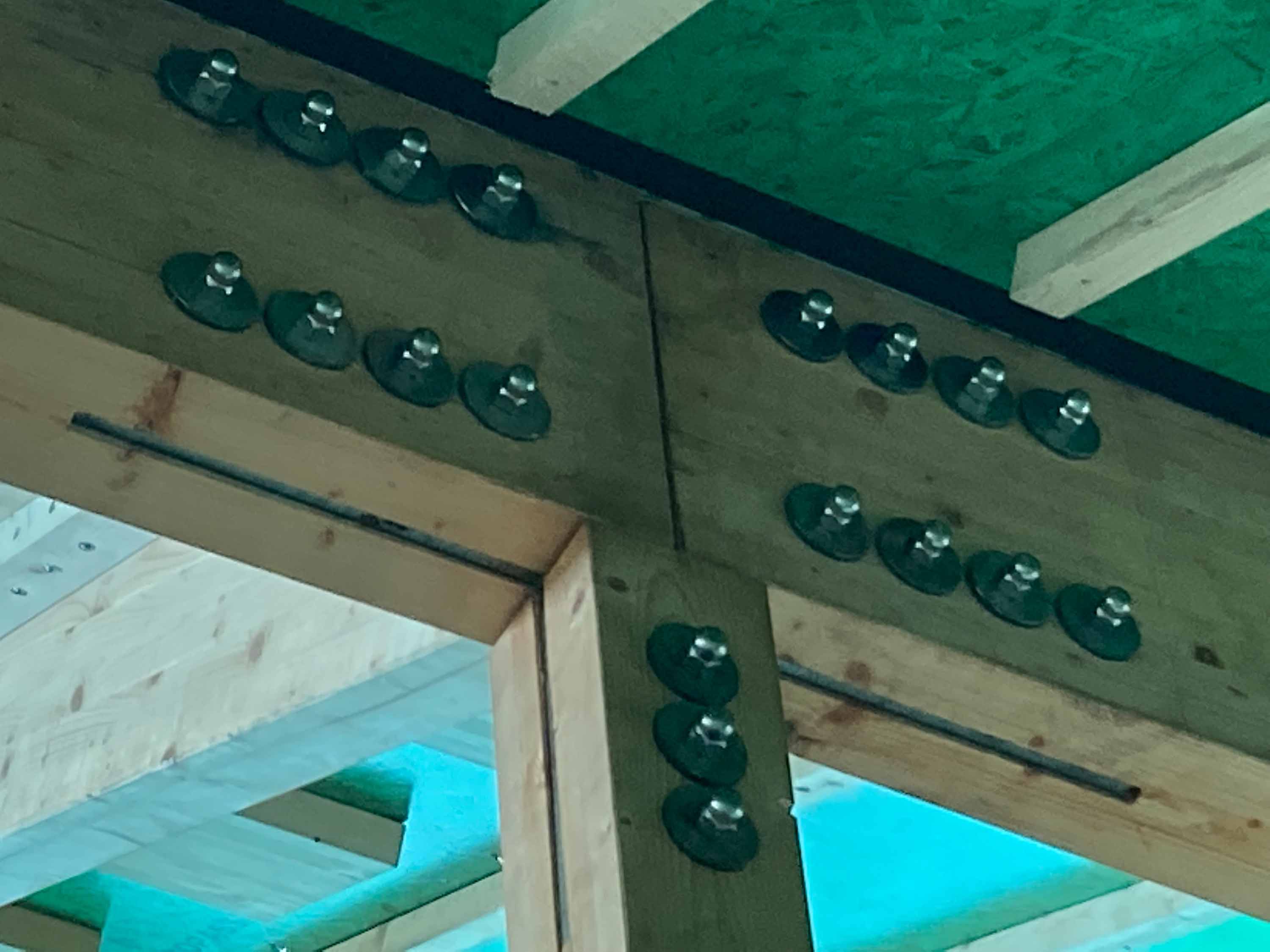 Thermal bridging: The PYC engineered I-beam has solid ‘flanges’ on both sides which are connected by an 8 mm web of OSB, which, being so narrow reduces thermal bridging to extremely low levels. The complex shape of the I-beam is easily filled with pressure injected Warmcel insulation to the required high densities maintaining insulation continuity. Y-factors (from SAP) calculated for each home, at 0.0276 W/m2K (dwelling 1), 0.0274 W/m2K (dwelling 2) and 0.031 W/m2K (dwelling 3)