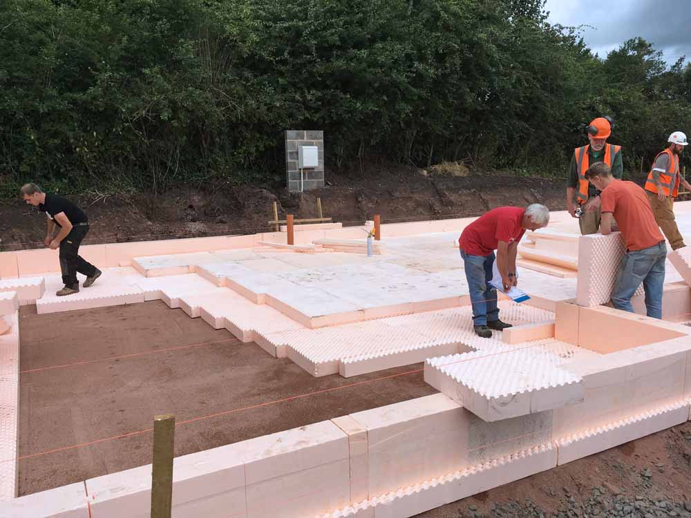 The floor construction is an Isoquick raft system, essentially a tub of EPS insulation with a concrete slab poured above and within the insulation. Compacfoam high density EPS is installed within the system under door thresholds to support their weight.