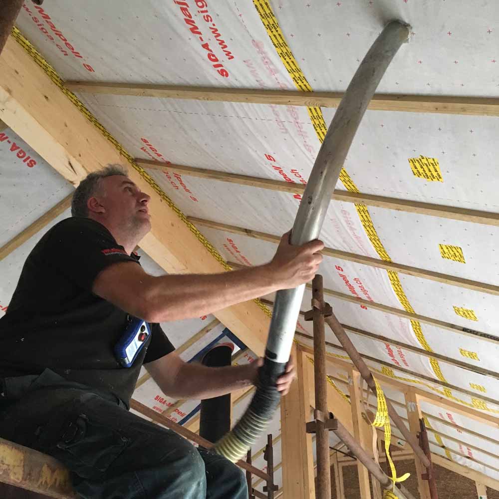 Cellulose expert Gordon Lewis pump-filling the Warmcel cellulose insulation into the roof