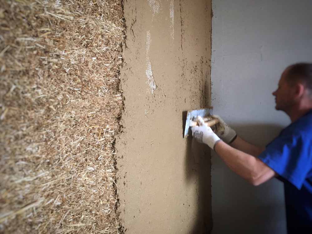 Internal clay plastering directly onto the straw, with reinforcing mesh visible