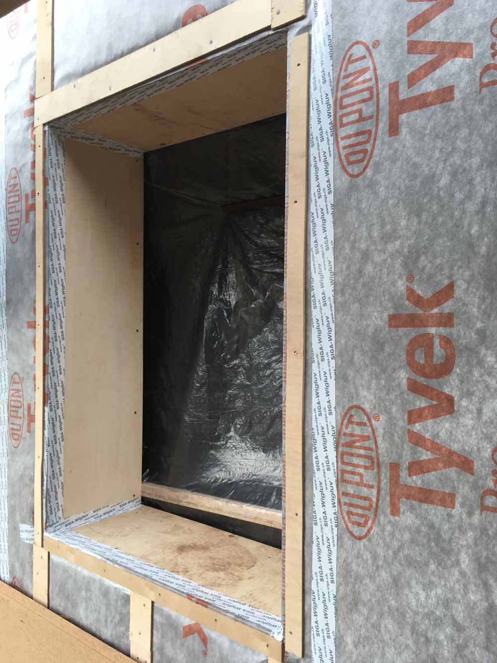 Nevertheless in the short period at the start before the roof and external sheathing went on, the structure was very vulnerable to any rain, making those weeks “a bit hairy”, as Mike put it. The structure had to be kept meticulously covered. In one small spot the wrapping must have failed, as Juraj later found that a patch of straw had sprouted, and had to be removed and replaced with cellulose insulation.
