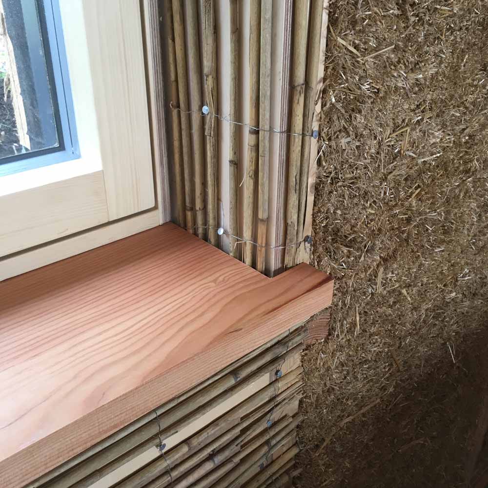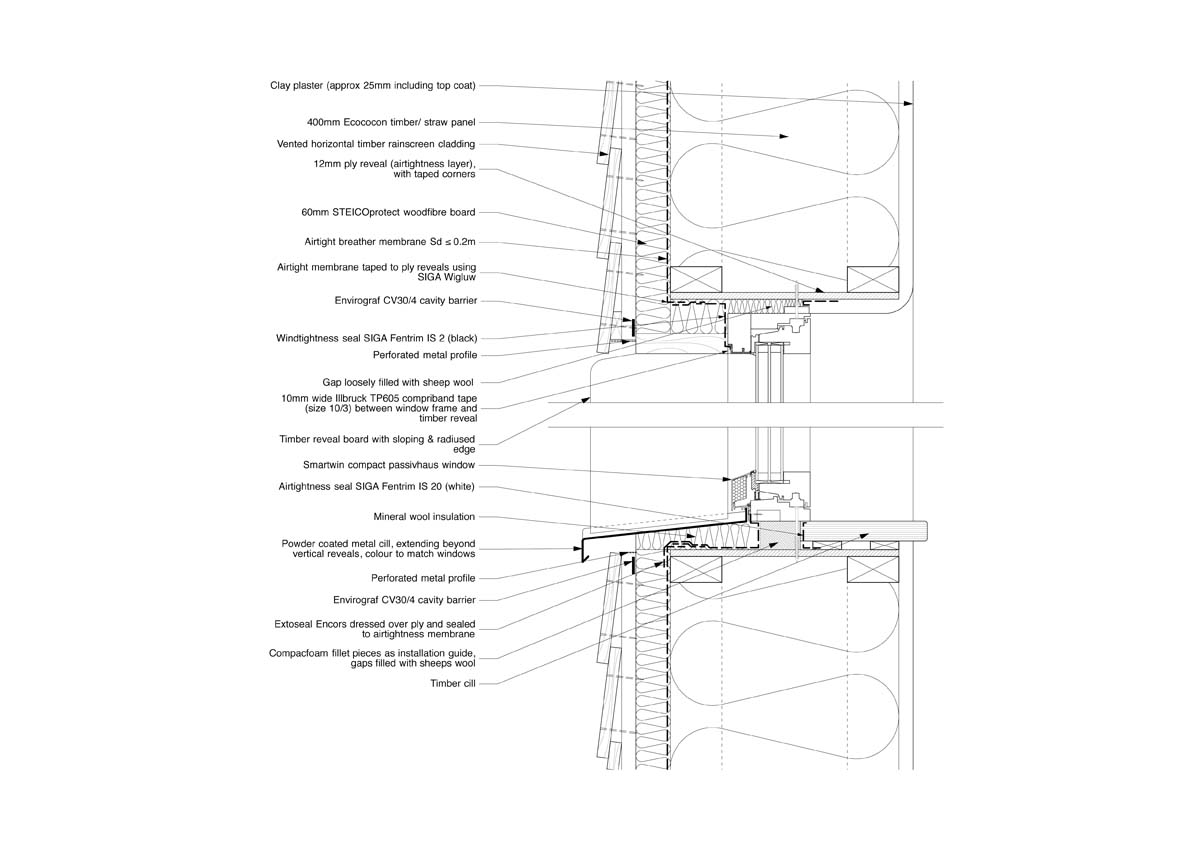 End panels and window reveals are faced with 12mm plywood, but otherwise the timber structure does not cross the straw layer, minimising thermal bridging, and enabling the system to achieve passive house certification.