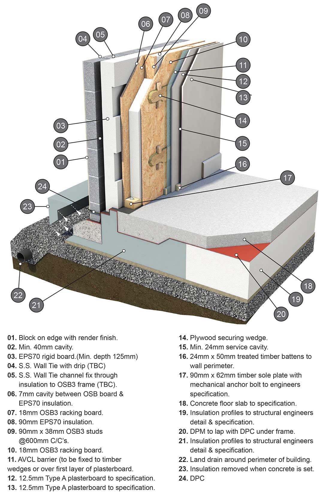 Ground floor (13B): Power floated finish to concrete floor slab, followed underneath by reinforced concrete slab, combined DPM/ radon barrier, radon sump, EPS200 & EPS100 insulated formwork, 50 mm binding, 200 mm to 300 mm of well-compacted hardcore. U-value: 0.09 W/m2K