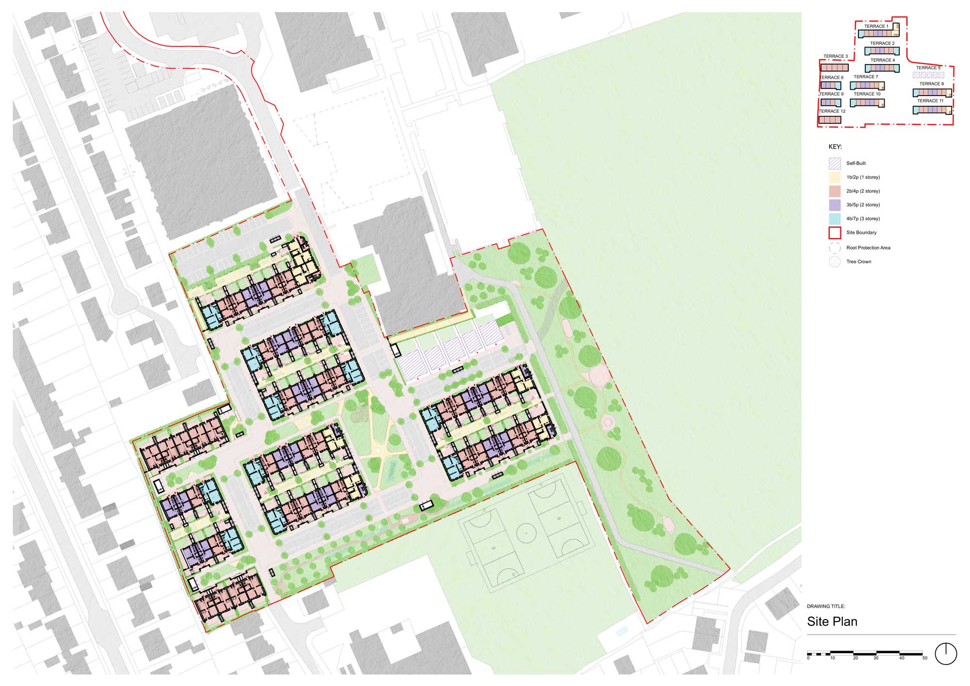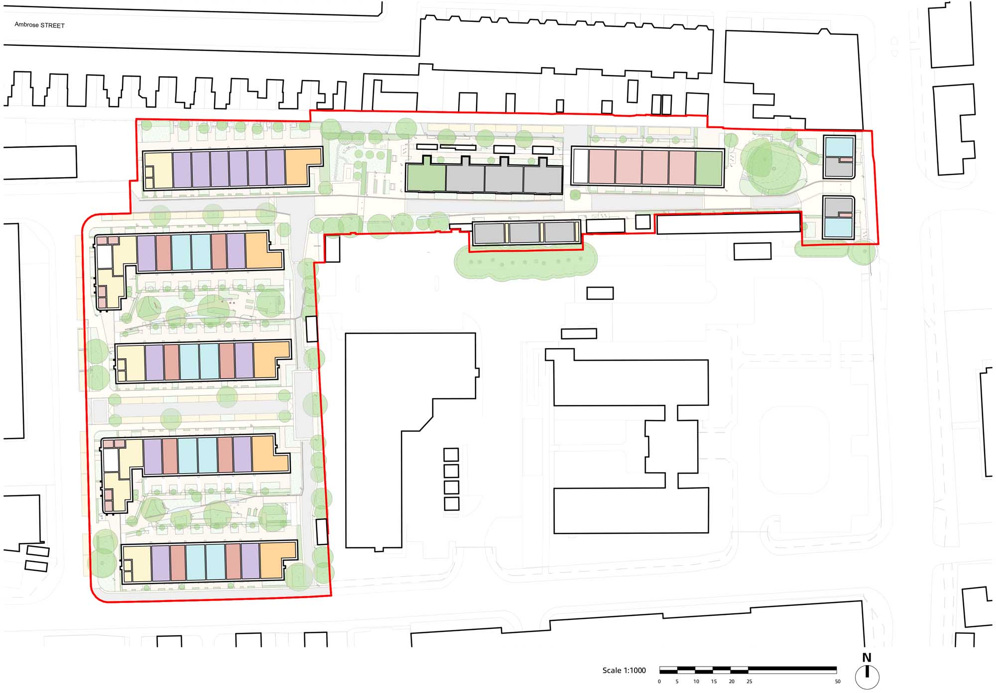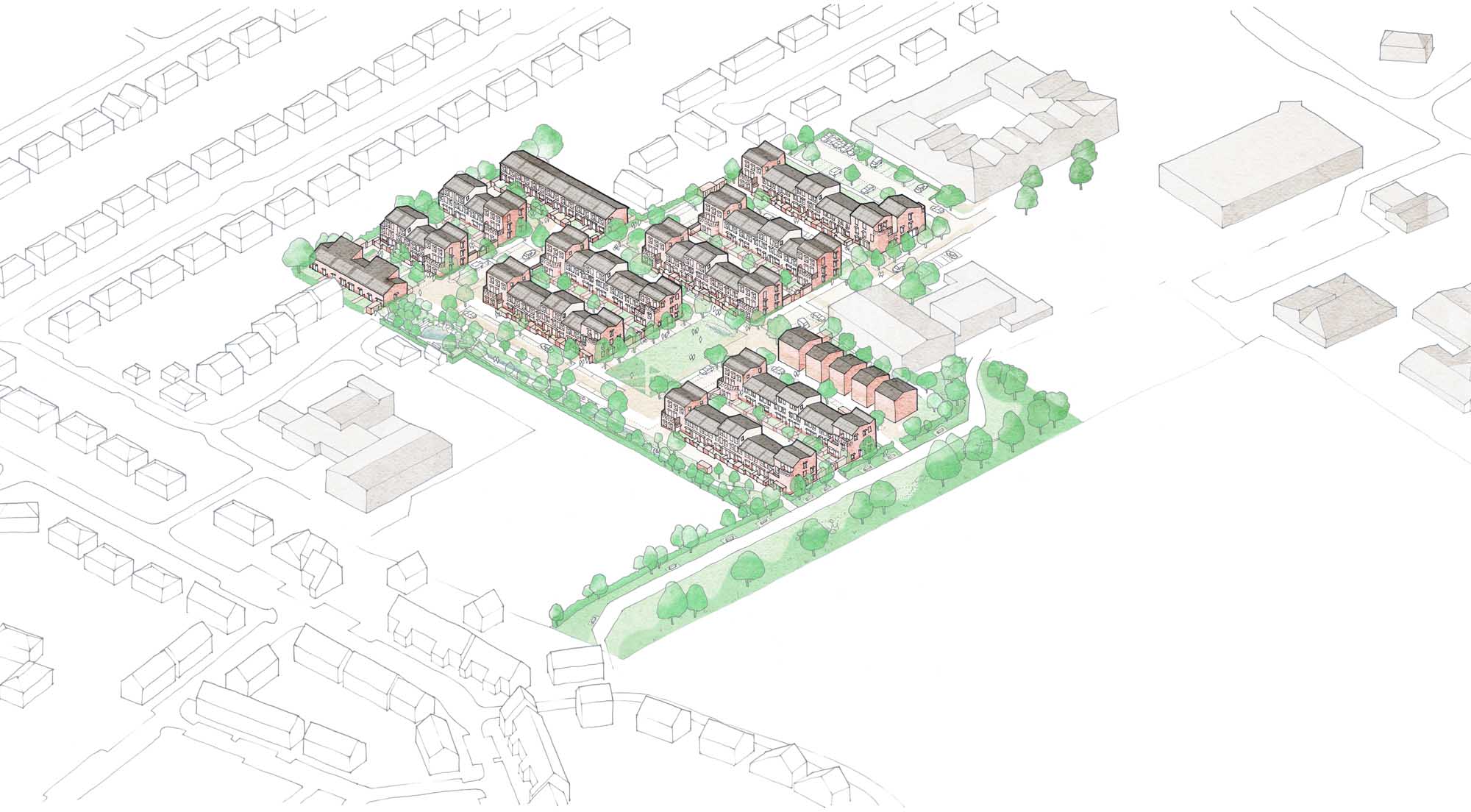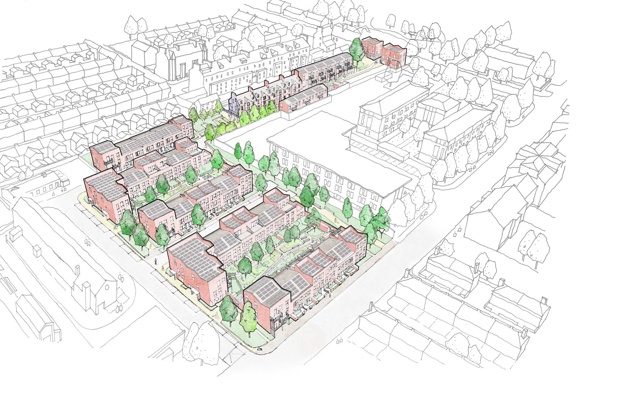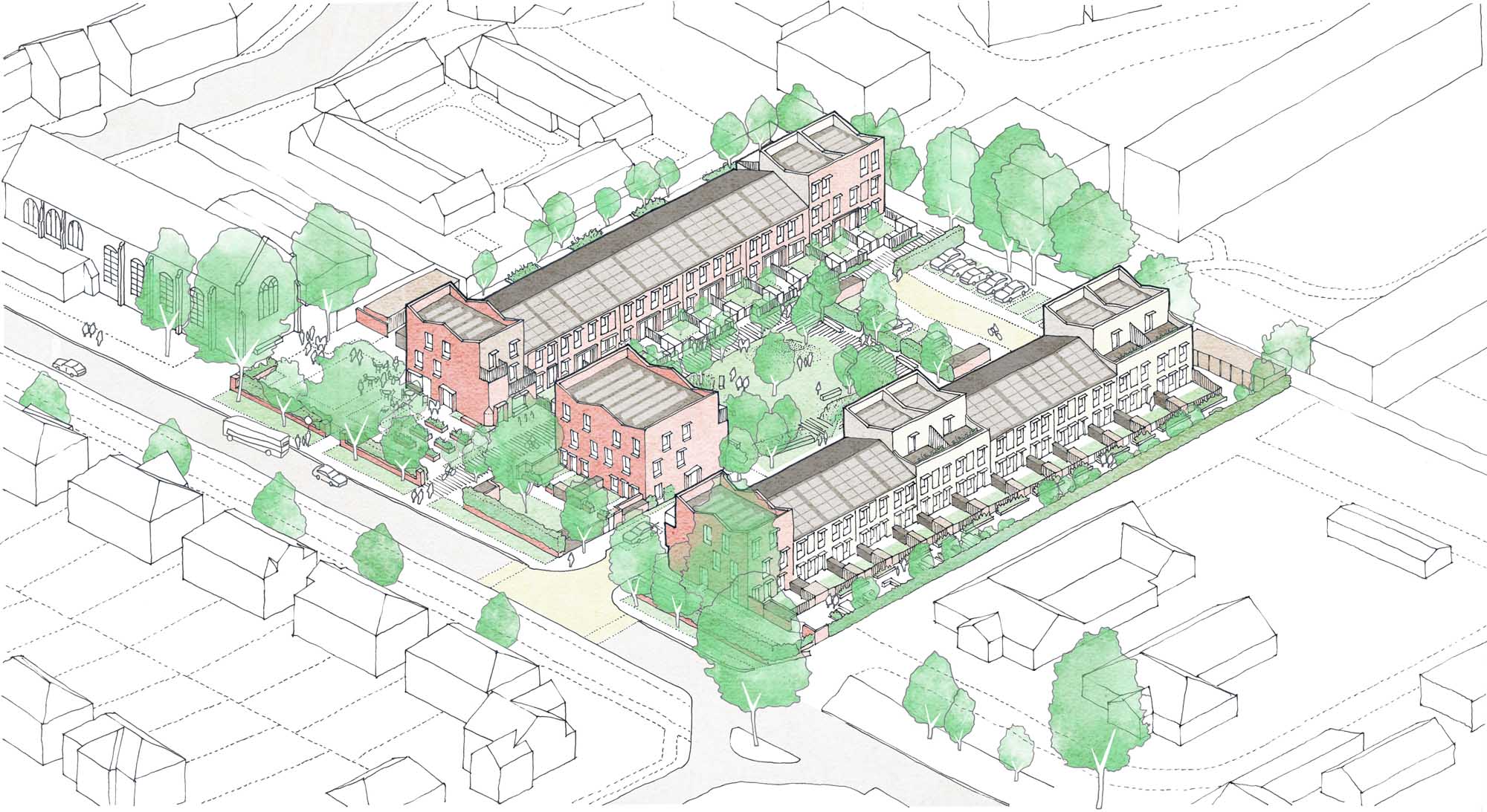 Budget: £13.69 m including land, works and on-costs for the whole development including thirty-four homes, one commercial unit, and high-quality public realm that comprises a central green space and a small civic square.
